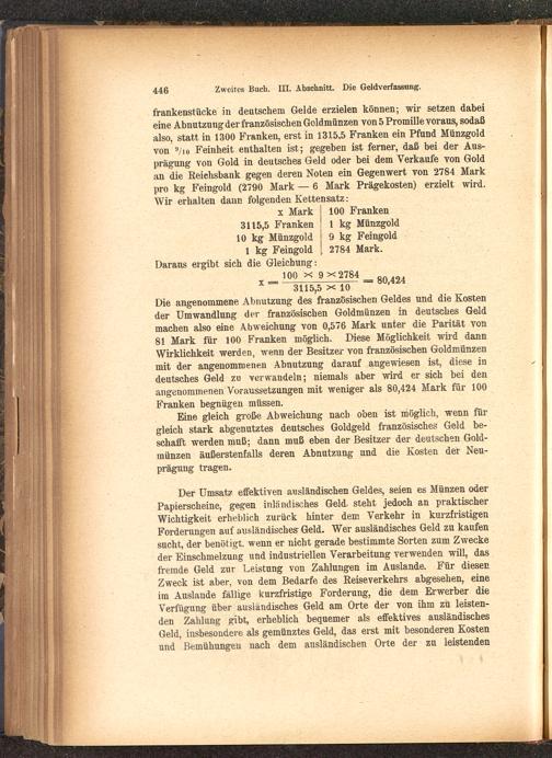 ■ 1QQ x 9 x 278 4X ~' 3115,5 x 10Die angenommene Abnutzung des französischen Geldes und die Kostender Umwandlung der französischen Goldmünzen in deutsches Geldmachen also eine Abweichung von 0,576 Mark unter die Parität Von81 Mark für 100 Franken möglich. Diese Möglichkeit wird dannWirklichkeit werden, wenn der Besitzer von französischen Goldmünzenmit der angenommenen Abnutzung darauf angewiesen ist, diese indeutsches Geld zu verwandeln; niemals aber wird er sich bei denangenommenen. Voraussetzungen mit weniger als 80,424 Mark für 100Franken begnügen müssen.