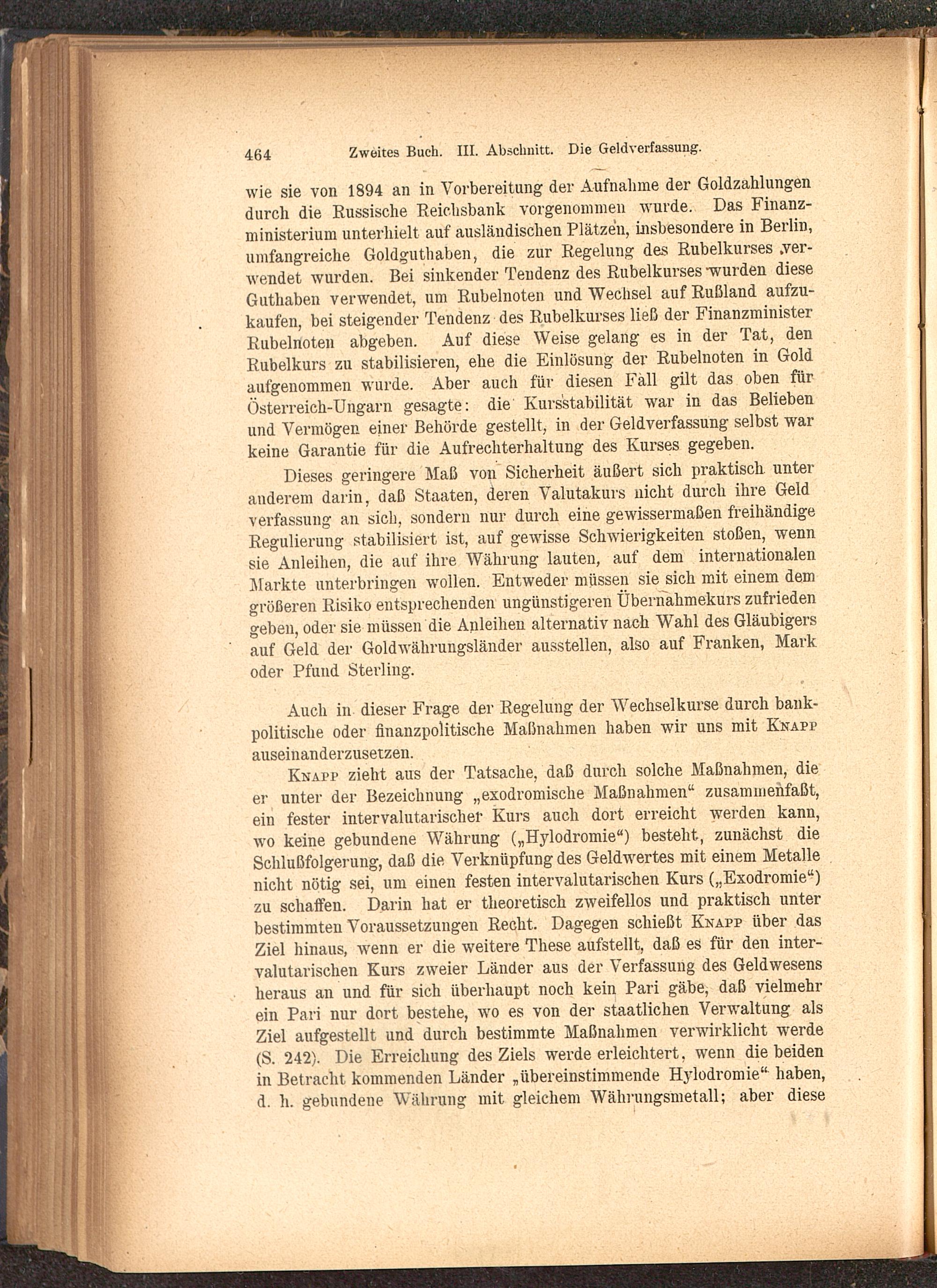 Knapp zieht aus der Tatsache, daß durch solche Maßnahmen, dieer unter der Bezeichnung „exodromische Maßnahmen'' zusammenfaßt,ein fester intervalutarischer Kurs auch dort erreicht werden kann,wo keine gebundene Währung („Hylodromie") besteht, zunächst dieSchlußfolgerung, daß die Verknüpfung des Geldwertes mit einem Metallenicht nötig sei, um einen festen intervalutarischen Kurs („Exodromie")zu schaffen. Darin hat er theoretisch zweifellos und praktisch unterbestimmten Voraussetzungen Recht. Dagegen schießt Knapp über dasZiel hinaus, wenn er die weitere These aufstellt, daß es für den inter-valutarischen Kurs zweier Länder aus der Verfassung des Geldwesensheraus an und für sich überhaupt noch kein Pari gäbe, daß vielmehrein Pari nur dort bestehe, wo es von der staatlichen Verwaltung alsZiel aufgestellt und durch bestimmte Maßnahmen verwirklicht werde(S. 242). Die Erreichung des Ziels werde erleichtert, wenn die beidenin Betracht kommenden Länder „übereinstimmende Hylodromie" haben,d. h. gebundene Währung mit gleichem Währungsmetall; aber diese