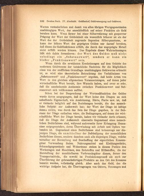 Wenn durch die erwähnten Erscheinungen auf dem Gebiete desmodernen Geldwesens der tatsächliche Nachweis für die Möglichkeiteines von der stofflichen Grundlage unabhängigen Geldwertes erbrachtist, so wird eine theoretische Betrachtung des Verhältnisses von„Substanzwert" und „Funktionswert" ergeben, daß beide Arten vonWert in den gleichen allgemeinen Voraussetzungen, auf denen jederwirtschaftliche Wert beruht, ihre Wurzeln haben, und zwar so sehr,daß die anscheinende Antinomie zwischen Funktionswert und Sub-stanzwert sich vollkommen auflöst.