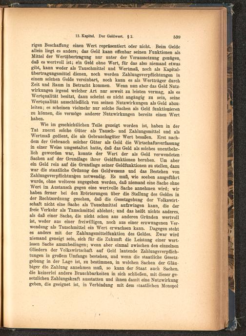 rigen Beschaffung einen Wert repräsentiert oder nicht. Beim Geldeallein liegt es anders; das Geld kann offenbar seinen Funktionen alsMittel der Wertübertragung nur unter der Voraussetzung genügen,daß es wertvoll ist; ein Geld ohne Wert, für das also niemand etwasgibt, kann weder als Tauschmittel und Wertmaß, noch als Kapital-übertragungsmittel dienen, noch werden Zahlungsverpflichtungen ineinem solchen Gelde vereinbart, noch kann es als Wertträger durchZeit und Raum in Betracht kommen. Wenn nun aber das Geld Nutz-wirkungen irgend welcher Art nur soweit zu leisten vermag, als esWertqualität besitzt, dann scheint es nicht angängig zu sein, seineWertqualität ausschließlich von seinen Nutzwirkungen als Geld abzu-leiten; es scheinen vielmehr nur solche Sachen als Geld funktionierenzu können, die vermöge anderer Nutzwirkungen bereits einen Werthaben.