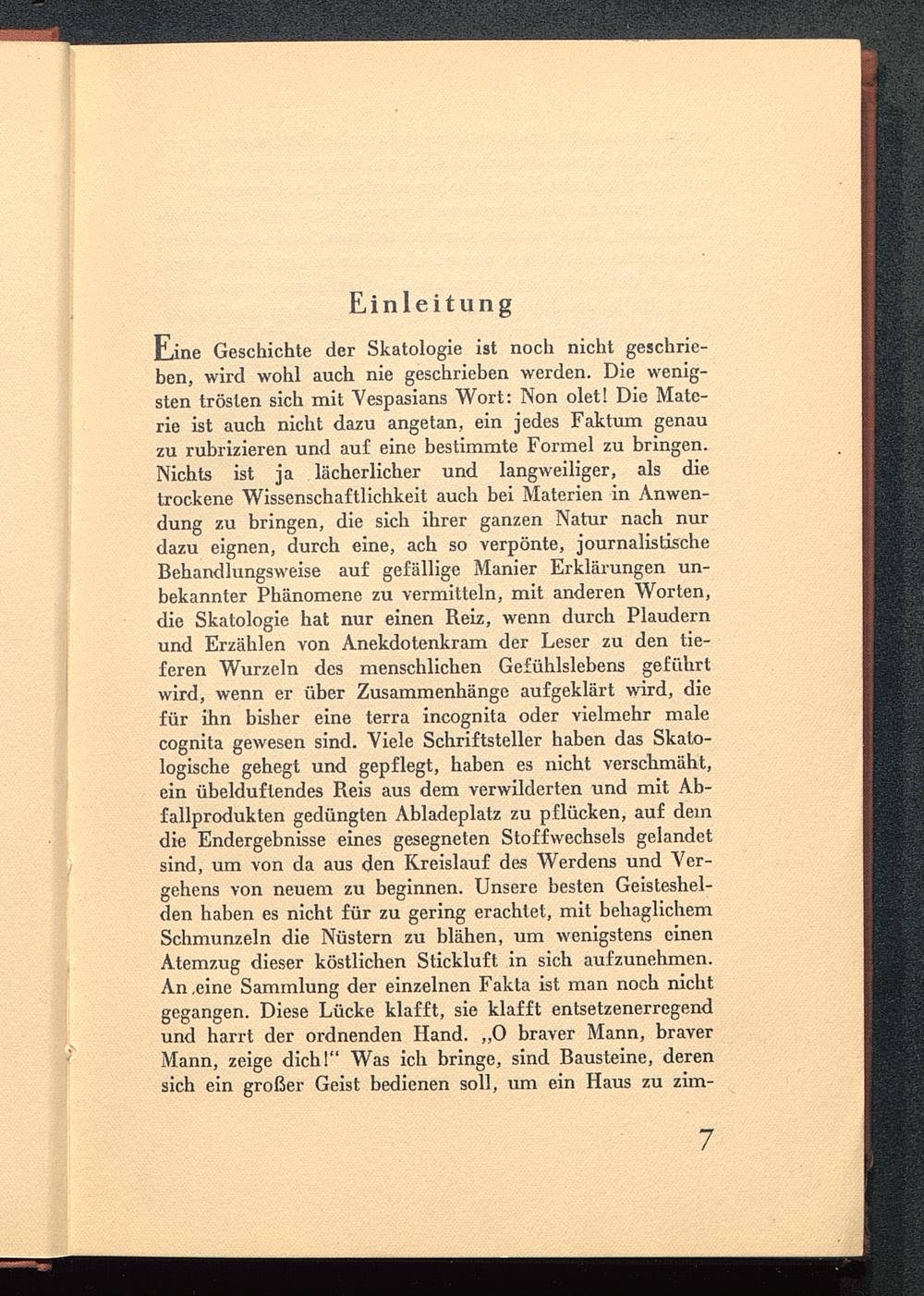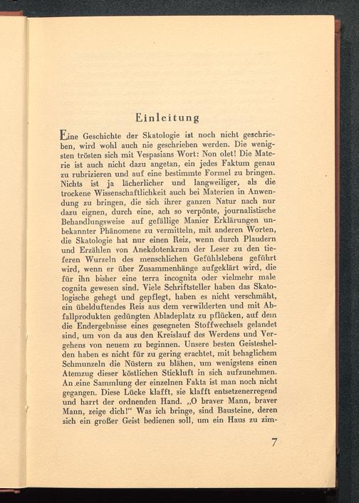 Eine Geschichte der Skatologie ist noch nicht geschrie-ben, wird wohl auch nie geschrieben werden. Die wenig-sten trösten sich mit Yespasians Wort: Non olet! Die Mate-rie ist auch nicht dazu angetan, ein jedes Faktum genauzu rubrizieren und auf eine bestimmte Formel zu bringen.Nichts ist ja lächerlicher und langweiliger, als dietrockene Wissenschaftlichkeit auch bei Materien in Anwen-dung zu bringen, die sich ihrer ganzen Natur nach nurdazu eignen, durch eine, ach so verpönte, journalistischeBehandlungsweise auf gefällige Manier Erklärungen un-bekannter Phänomene zu vermitteln, mit anderen Worten,die Skatologie hat nur einen Reiz, wenn durch Plaudernund Erzählen von Anekdotenkram der Leser zu den tie-feren Wurzeln des menschlichen Gefühlslebens geführtwird, wenn er über Zusammenhänge aufgeklärt wird, diefür ihn bisher eine terra incognita oder vielmehr malecognita gewesen sind. Viele Schriftsteller haben das Skalo-logische gehegt und gepflegt, haben es nicht verschmäht,ein übelduftendes Reis aus dem verwilderten und mit Ab-fallprodukten gedüngten Abladeplatz zu pflücken, auf deindie Endergebnisse eines gesegneten Stoffwechsels gelandetsind, um von da aus den Kreislauf des Werdens und Ver-gehens von neuem zu beginnen. Unsere besten Geisteshel-den haben es nicht für zu gering erachtet, mit behaglichemSchmunzeln die Nüstern zu blähen, um wenigstens einenAtemzug dieser köstlichen Stickluft in sich aufzunehmen.An .eine Sammlung der einzelnen Fakta ist man noch nichtgegangen. Diese Lücke klafft, sie klafft entsetzenerregendund harrt der ordnenden Hand. „0 braver Mann, braverMann, zeige dich!" Was ich bringe, sind Bausteine, derensich ein großer Geist bedienen soll, um ein Haus zu zim-