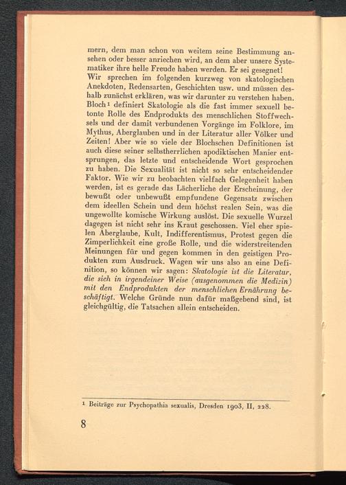 mern, dem man schon von weitem seine Bestimmung an-sehen oder besser anriechen wird, an dem aber unsere Syste-matiker ihre helle Freude haben werden. Er sei gesegnet!Wir sprechen im folgenden kurzweg von skatologischenAnekdoten, Redensarten, Geschichten usw. und müssen des-halb zunächst erklären, was wir darunter zu verstehen haben.Bloch i definiert Skatologie als die fast immer sexuell be-tonte Rolle des Endprodukts des menschlichen Stoffwech-sels und der damit verbundenen Vorgänge im Folklore, imMythus , Aberglauben und in der Literatur aller Völker undZeiten! Aber wie so viele der Blochschen Definitionen istauch diese seiner selbstherrlichen apodiktischen Manier ent-sprungen, das letzte und entscheidende Wort gesprochenzu haben. Die Sexualität ist nicht so sehr entscheidenderFaktor. Wie wir zu beobachten vielfach Gelegenheit habenwerden, ist es gerade das Lächerliche der Erscheinung, derbewußt oder unbewußt empfundene Gegensatz zwischendem ideellen Schein und dem höchst realen Sein, was dieungewollte komische Wirkung auslöst. Die sexuelle Wurzeldagegen ist nicht sehr ins Kraut geschossen. Viel eher spie-len Aberglaube, Kult, Indifferentismus, Protest gegen dieZimperlichkeit eine große Rolle, und die widerstreitendenMeinungen für und gegen kommen in den geistigen Pro-dukten zum Ausdruck. Wagen wir uns also an eine Defi-nition, so können wir sagen: Skatologie ist die Literatur,die sich in irgendeiner Weise (ausgenommen die Medizin)mit den Endprodukten der menschlichen Ernährung be-schäftigt. Welche Gründe nun dafür maßgebend sind, istgleichgültig, die Tatsachen allein entscheiden.