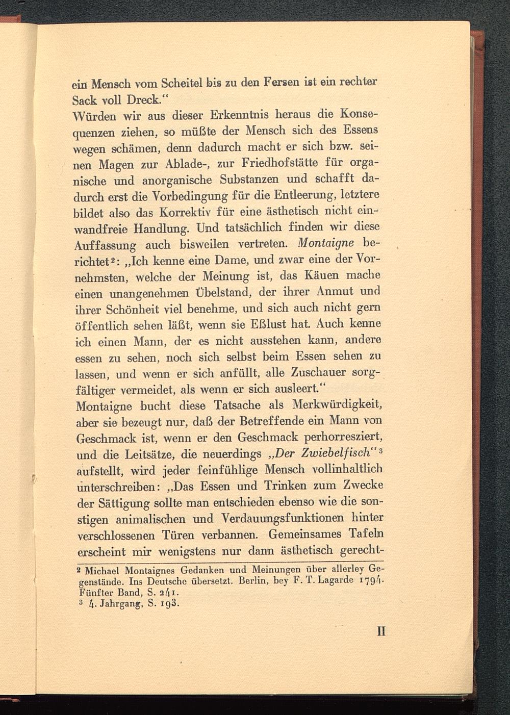 2 Michael Montaignes Gedanken und Meinungen über allerley Ge-genstände. Ins Deutsche übersetzt. Berlin, bey F. T. Lagarde 179').Fünfter Band, S. ail.