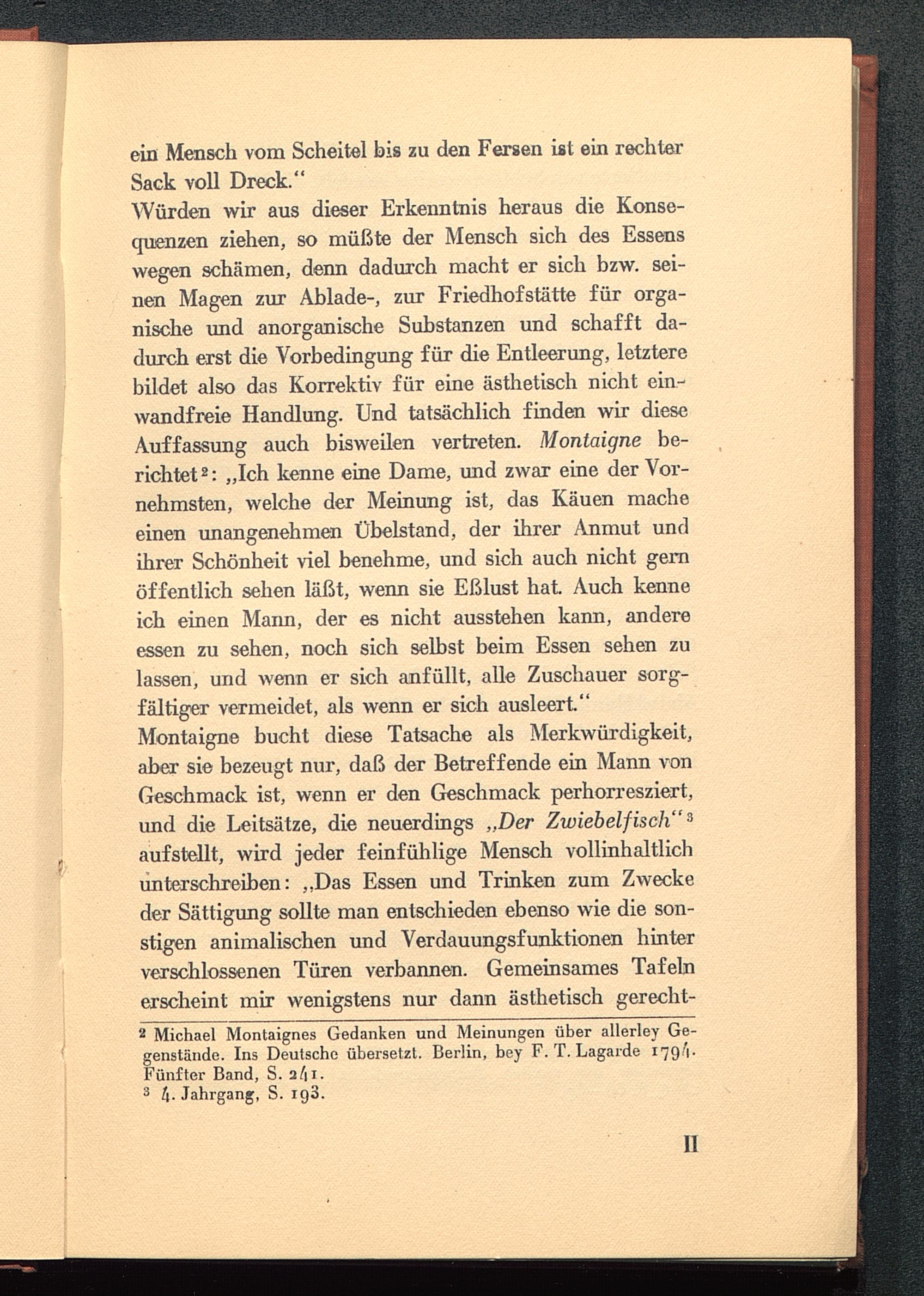 Würden wir aus dieser Erkenntnis heraus die Konse-quenzen ziehen, so müßte der Mensch sich des Essenswegen schämen, denn dadurch macht er sich bzw. sei-nen Magen zur Ablade-, zur Friedhofstätte für orga-nische und anorganische Substanzen und schafft da-durch erst die Vorbedingung für die Entleerung, letzterebildet also das Korrektiv für eine ästhetisch nicht ein-wandfreie Handlung. Und tatsächlich finden wir dieseAuffassung auch bisweilen vertreten. Montaigne be-richtet 2 : „Ich kenne eine Dame, und zwar eine der Vor-nehmsten, welche der Meinung ist, das Käuen macheeinen unangenehmen Übelstand, der ihrer Anmut undihrer Schönheit viel benehme, und sich auch nicht gernöffentlich sehen läßt, wenn sie Eßlust hat. Auch kenneich einen Mann, der es nicht ausstehen kann, andereessen zu sehen, noch sich selbst beim Essen sehen zulassen, und wenn er sich anfüllt, alle Zuschauer sorg-fältiger vermeidet, als wenn er sich ausleert."Montaigne bucht diese Tatsache als Merkwürdigkeit,aber sie bezeugt nur, daß der Betreffende ein Mann vonGeschmack ist, wenn er den Geschmack perhorresziert,und die Leitsätze, die neuerdings „Der Zwiebelfisch" 3aufstellt, wird jeder feinfühlige Mensch vollinhaltlichunterschreiben: ,.Das Essen und Trinken zum Zweckeder Sättigung sollte man entschieden ebenso wie die son-stigen animalischen und Verdauungsfunktionen hinterverschlossenen Türen verbannen. Gemeinsames Tafelnerscheint mir wenigstens nur dann ästhetisch gerecht-