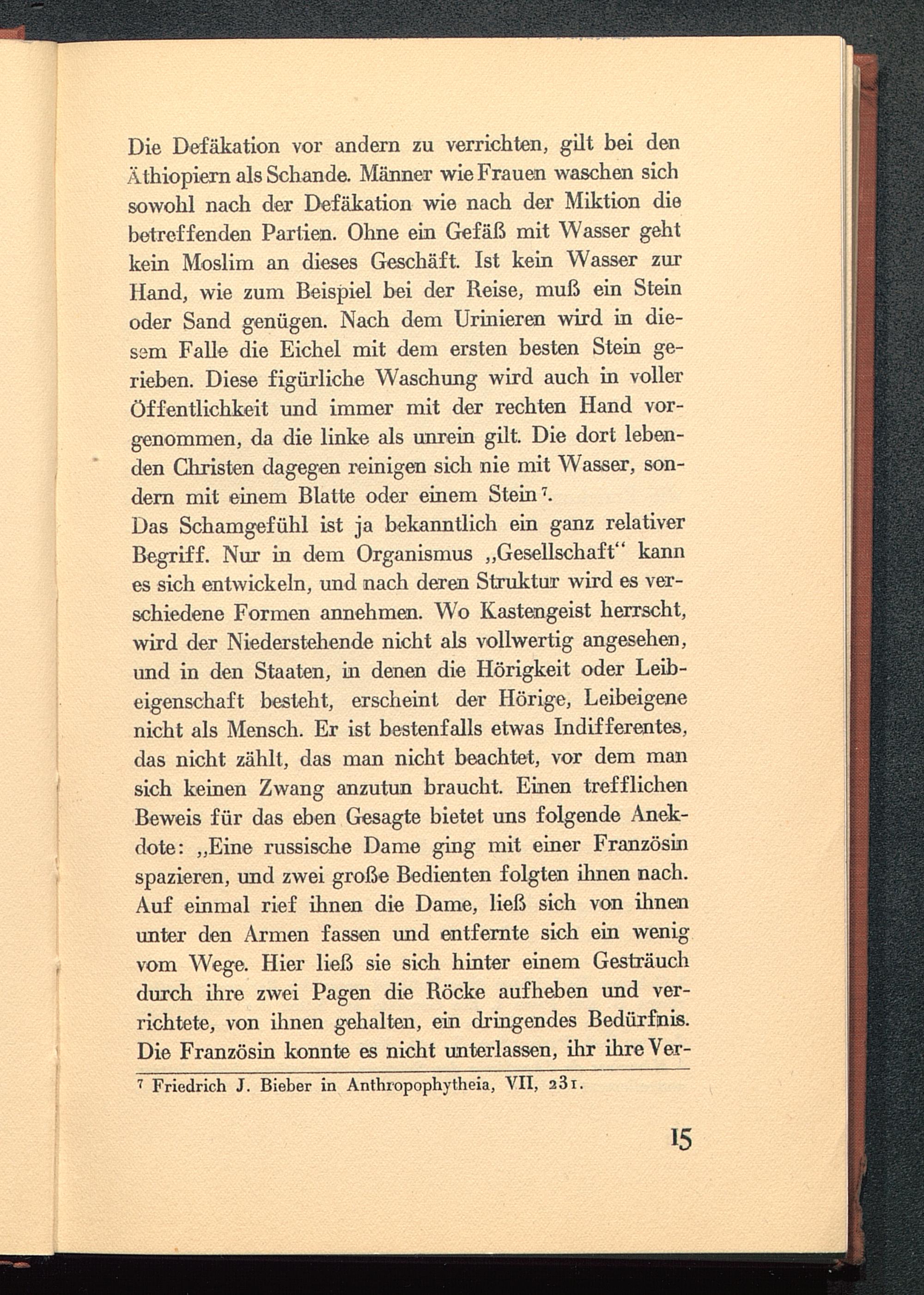 Die Defäkation vor andern zu verrichten, gilt bei denÄthiopiern als Schande. Männer wie Frauen waschen sichsowohl nach der Defäkation wie nach der Miktion diebetreffenden Partien. Ohne ein Gefäß mit Wasser gehtkein Moslirn an dieses Geschäft. Ist kein Wasser zurHand, wie zum Beispiel bei der Reise, muß ein Steinoder Sand genügen. Nach dem Urinieren wird in die-sam Falle die Eichel mit dem ersten besten Stein ge-rieben. Diese figürliche Waschung wird auch in vollerÖffentlichkeit und immer mit der rechten Hand vor-genommen, da die linke als unrein gilt. Die dort leben-den Christen dagegen reinigen sich nie mit Wasser, son-dern mit einem Blatte oder einem Stein 7 .Das Schamgefühl ist ja bekanntlich ein ganz relativerBegriff. Nur in dem Organismus „Gesellschaft" kannes sich entwickeln, und nach deren Struktur wird es ver-schiedene Formen annehmen. Wo Kastengeist herrscht,wird der Niederstehende nicht als vollwertig angesehen,und in den Staaten, in denen die Hörigkeit oder Leib-eigenschaft besteht, erscheint der Hörige, Leibeigenenicht als Mensch. Er ist bestenfalls etwas Indifferentes,das nicht zählt, das man nicht beachtet, vor dem mansich keinen Zwang anzutun braucht. Einen trefflichenBeweis für das eben Gesagte bietet uns folgende Anek-dote: „Eine russische Dame ging mit einer Französinspazieren, und zwei große Bedienten folgten ihnen nach.Auf einmal rief ihnen die Dame, ließ sich von ihnenunter den Armen fassen und entfernte sich ein wenigvom Wege. Hier ließ sie sich hinter einem Gesträuchdurch ihre zwei Pagen die Böcke aufheben und ver-richtete, von ihnen gehalten, ein dringendes Bedürfnis.Die Französin konnte es nicht unterlassen, ihr ihreVer-7 Friedrich J. Bieber in Anthropophytheia, VII, 231.