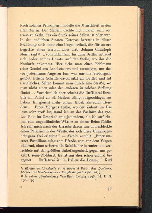 Nach solchen Prinzipien handelte die Menschheit in denalten Zeiten. Der Mensch dachte nicht daran, sich voretwas zu ekeln, das ein Stück seines Selbst ist oder war.In den südlichen Staaten Europas herrscht in dieserBeziehung noch heute eine Ungeniertheit, die für unsereBegriffe etwas Erstaunliches hat Johann ChristophMaier sagt 10 : „Vom Edelmann bis zum Bettler entladetsich jeder seines Unrats auf der Stelle, wo ihn dieNotdurft ankömmt Hier sieht man einen Edelmannseine Gondel ans Land steuern und aussteigen, um dasvor jedermanns Auge zu tun, was nur ins Verborgenegehört. Etliche Schritte davon sitzt ein Bettler und tutein gleiches. Selten kommt man durch eine Straße, woman nicht einen oder den anderen in solcher Stellungfindet... Vornehmlich aber scheint die Unfläterei ihrenSitz im Palast zu St. Markus völlig aufgeschlagen zuhaben. Er gleicht mehr einem Kloak als einer Besi-denz... Eines Morgens frühe, wo der Zulauf im Pa-laste sehr groß ist, stand ich an der Saaltüre des gro-ßen Bats im Gespräch mit jemandem, als ich auf ein-mal eine ungewöhnliche Wärme an einem Beine fühlte.Ich sah mich nach der Ursache davon um und erblickteeinen Patrizier in der Weste, der sich diese Ungezogen-heit ganz frei erlaubte." — Nicolai erzählt: „Einer un-serer Postillione stieg vom Pferde, zog, vor dem Wagenbleibend, ohne weiteres die Beinkleider herunter und ver-richtete mit der größten Unbefangenheit, gegen uns ge-kehrt, seine Notdurft Es ist uns dies schon einmal be-gegnet... Unf läterei ist in Italien die Losung." Karl
