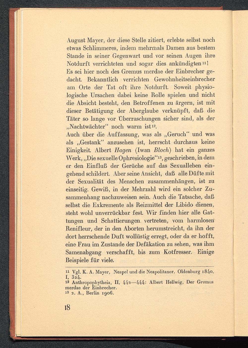 Auch über die Auffassung, was als „Geruch" und wasals „Gestank" anzusehen ist, herrscht durchaus keineEinigkeit. Albert Hagen (Iwan Bloch ) hat ein ganzesWerk, „Die sexuelle Ophresiologie" 13 , geschrieben, in demer den Einfluß der Gerüche auf das Sexualleben ein-gehend schildert. Aber seine Ansicht, daß alle Düfte mitder Sexualität des Menschen zusammenhängen, ist zueinseitig. Gewiß, in der Mehrzahl wird ein solcher Zu-sammenhang nachzuweisen sein. Auch die Tatsache, daßselbst die Exkremente als Reizmittel der Libido dienen,steht wohl unverrückbar fest Wir finden hier alle Gat-tungen und Schattierungen, vertreten, vom harmlosenRenifleur, der in den Aborten herumstreicht, da ihn derdort herrschende Duft wollüstig erregt, oder da er hofft,eine Frau im Zustande der Defäkation zu sehen, was ihmSamenabgang verschafft, bis zum Kotfresser. EinigeBeispiele für viele.