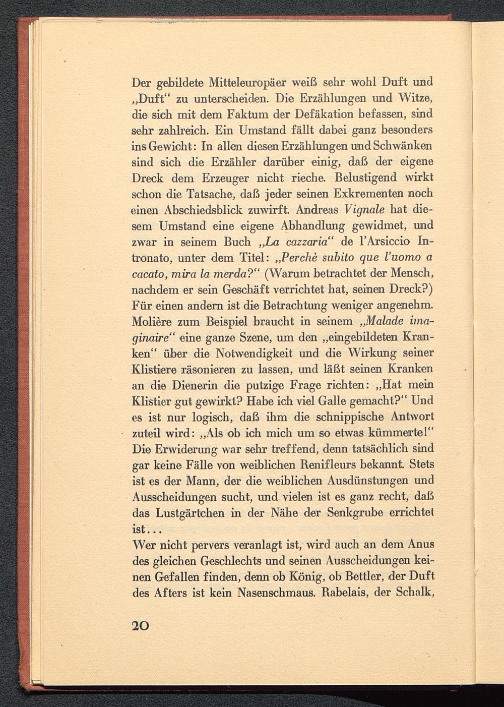 Wer nicht pervers veranlagt ist, wird auch an dem Anusdes gleichen Geschlechts und seinen Ausscheidungen kei-nen Gefallen finden, denn ob König, ob Bettler, der Duftdes Afters ist kein Nasenschmaus. Rabelais , der Schalk,