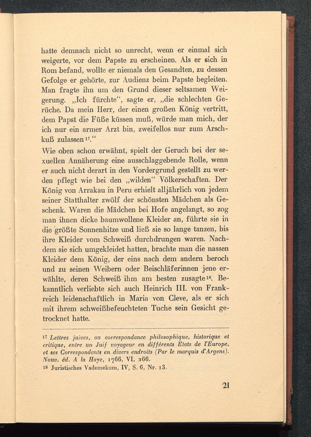 Wie oben schon erwähnt, spielt der Geruch bei der se-xuellen Annäherung eine ausschlaggebende Rolle, wenner auch nicht derart in den Vordergrund gestellt zu wer-den pflegt wie bei den „wilden" Völkerschaften. DerKönig von Arrakau in Peru erhielt alljährlich von jedemseiner Statthalter zwölf der schönsten Mädchen als Ge-schenk. Waren die Mädchen bei Hofe angelangt, so zogman ihnen dicke baumwollene Kleider an, führte sie indie größte Sonnenhitze und ließ sie so lange tanzen, bisihre Kleider vom Schweiß durchdrungen waren. Nach-dem sie sich umgekleidet hatten, brachte man die nassenKleider dem König, der eins nach dem andern berochund zu seinen Weibern oder Beischläferinnen jene er-wählte, deren Schweiß ihm am besten zusagte 18 . Be-kanntlich verliebte sich auch Heinrich III. von Frank-reich leidenschaftlich in Maria von Cleve, als er sichmit ihrem schweißbefeuchteten Tuche sein Gesicht ge-trocknet hatte.