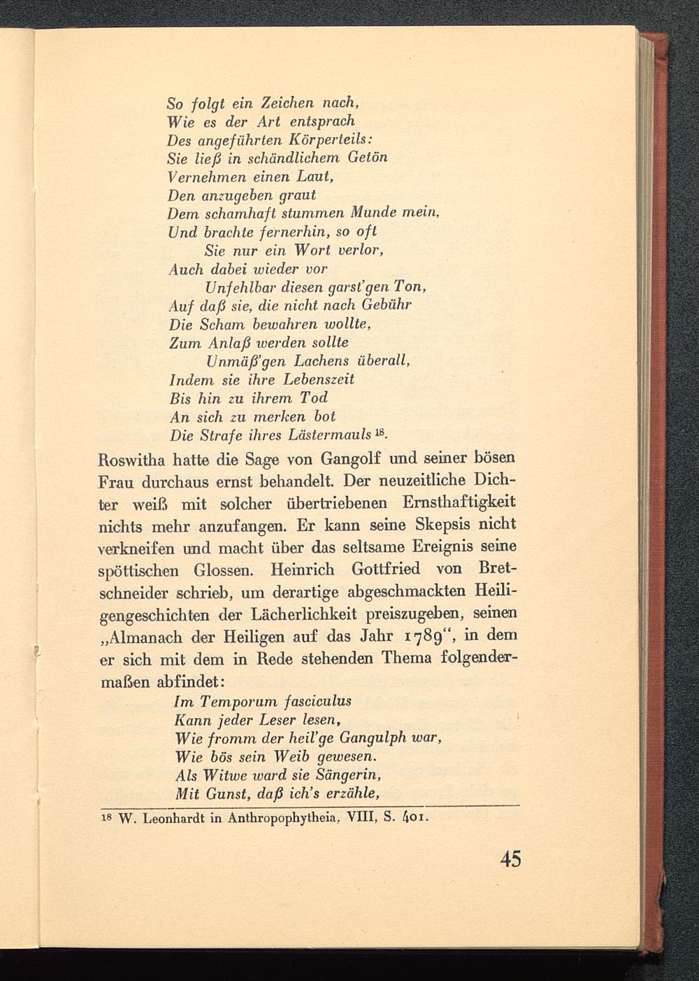 Roswitha hatte die Sage von Gangolf und seiner bösenFrau durchaus ernst behandelt. Der neuzeitliche Dich-ter weiß mit solcher übertriebenen Ernsthaftigkeitnichts mehr anzufangen. Er kann seine Skepsis nichtverkneifen und macht über das seltsame Ereignis seinespöttischen Glossen. Heinrich Gottfried von Bret-schneider schrieb, um derartige abgeschmackten Heili-gengeschichten der Lächerlichkeit preiszugeben, seinen„Almanach der Heiligen auf das Jahr 1789", in demer sich mit dem in Rede stehenden Thema folgender-maßen abfindet: