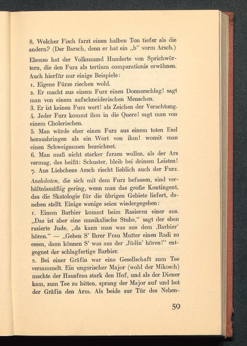 Anekdoten, die sich mit dem Furz befassen, sind ver-hältnismäßig gering, wenn man das große Kontingent,das die Skatologie für die übrigen Gebiete liefert, da-neben steUt. Einige wenige seien wiedergegeben: