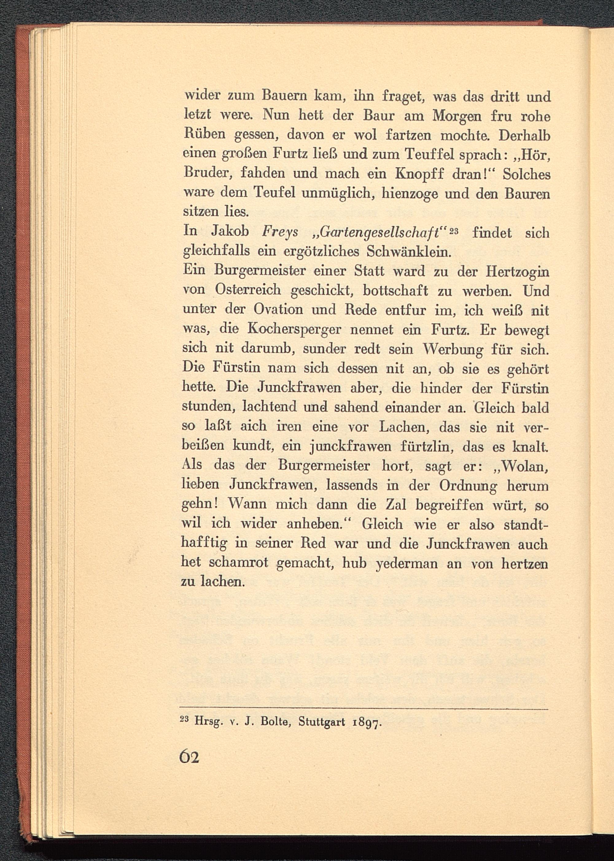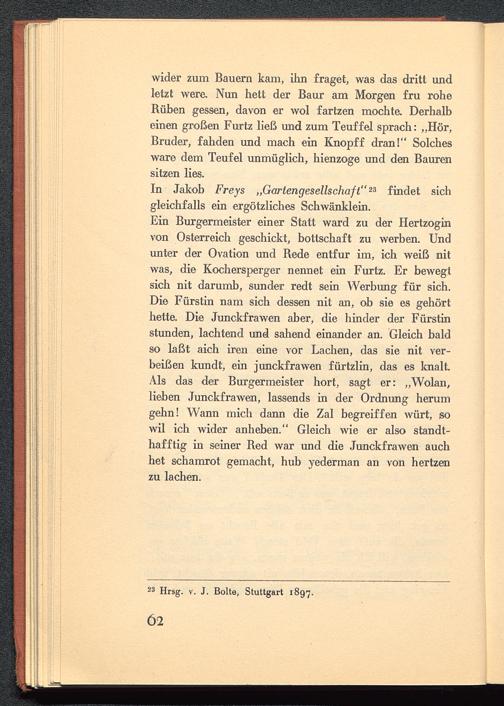 In Jakob Freys „Gartengesellschaft" 23 findet sichgleichfalls ein ergötzliches Schwänklein.Ein Burgermeister einer Statt ward zu der Hertzoginvon Osterreich geschickt, bottschaft zu werben. Undunter der Ovation und Rede entfur im, ich weiß nitwas, die Kochersperger nennet ein Furtz. Er bewegtsich nit darumb, sunder redt sein Werbung für sich.Die Fürstin nam sich dessen nit an, ob sie es gehörthette. Die Junckfrawen aber, die hinder der Fürstinstunden, lachtend und sahend einander an. Gleich baldso laßt aich iren eine vor Lachen, das sie nit ver-beißen kundt, ein junckfrawen fürtzlin, das es knaltAls das der Burgermeister hört, sagt er: „Wolan,lieben Junckfrawen, lassends in der Ordnung herumgehn! Wann mich dann die Zal begreiffen würt, sowil ich wider anheben." Gleich wie er also standt-hafftig in seiner Red war und die Junckfrawen auchhet schamrot gemacht, hub yederman an von hertzenzu lachen.