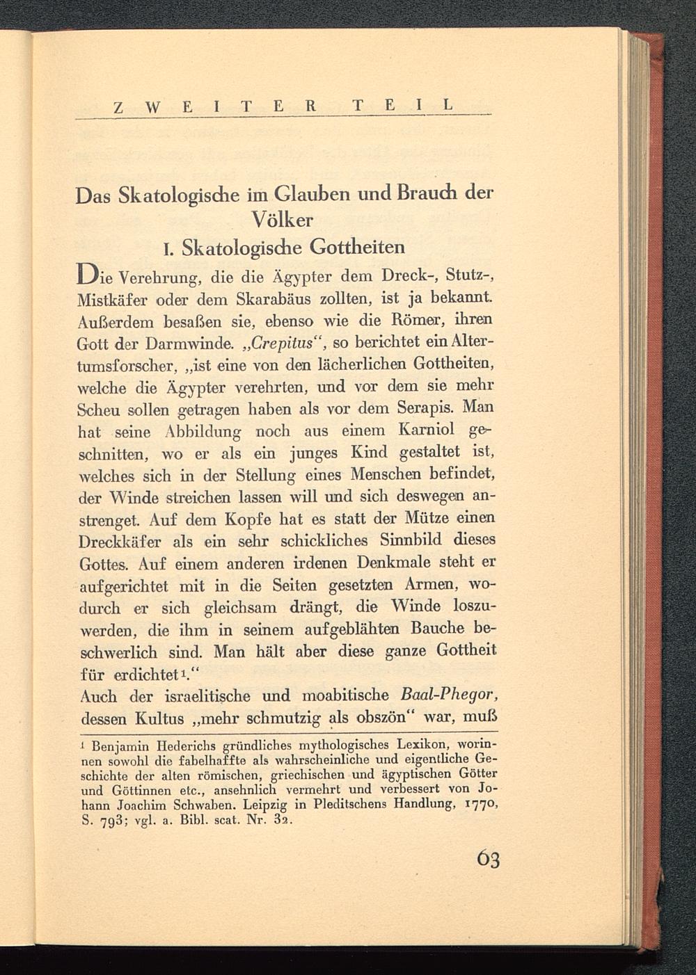1 Benjamin Hederichs gründliches mythologisches Lexikon, worin-nen sowohl die fabelhaffte als wahrscheinliche und eigentliche Ge-schichte der alten römischen, griechischen und ägyptischen Götterund Göttinnen etc., ansehnlich vermehrt und verbessert von Jo-hann Joachim Schwaben. Leipzig in Pleditschens Handlung, 1770,S. 79,3; vgl. a. Bibl. scat. Nr. 3a.