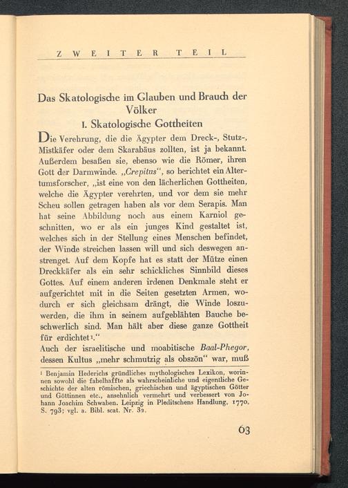 Die Verehrung, die die Ägypter dem Dreck-, Stutz-,Mistkäfer oder dem Skarabäus zollten, ist ja bekannt.Außerdem besaßen sie, ebenso wie die Römer, ihrenGott der Darmwinde. „Crepitus", so berichtet ein Alter-tumsforscher, „ist eine von den lächerlichen Gottheiten,welche die Ägypter verehrten, und vor dem sie mehrScheu sollen getragen haben als vor dem Serapis. Manhat seine Abbildung noch aus einem Karniol ge-schnitten, wo er als ein junges Kind gestaltet ist,welches sich in der Stellung eines Menschen befindet,der Winde streichen lassen will und sich deswegen an-strenget. Auf dem Kopfe hat es statt der Mütze einenDreckkäfer als ein sehr schickliches Sinnbild diesesGottes. Auf einem anderen irdenen Denkmale steht eraufgerichtet mit in die Seiten gesetzten Armen, wo-durch er sich gleichsam drängt, die Winde loszu-werden, die ihm in seinem aufgeblähten Bauche be-schwerlich sind. Man hält aber diese ganze Gottheitfür erdichtet 1 ."