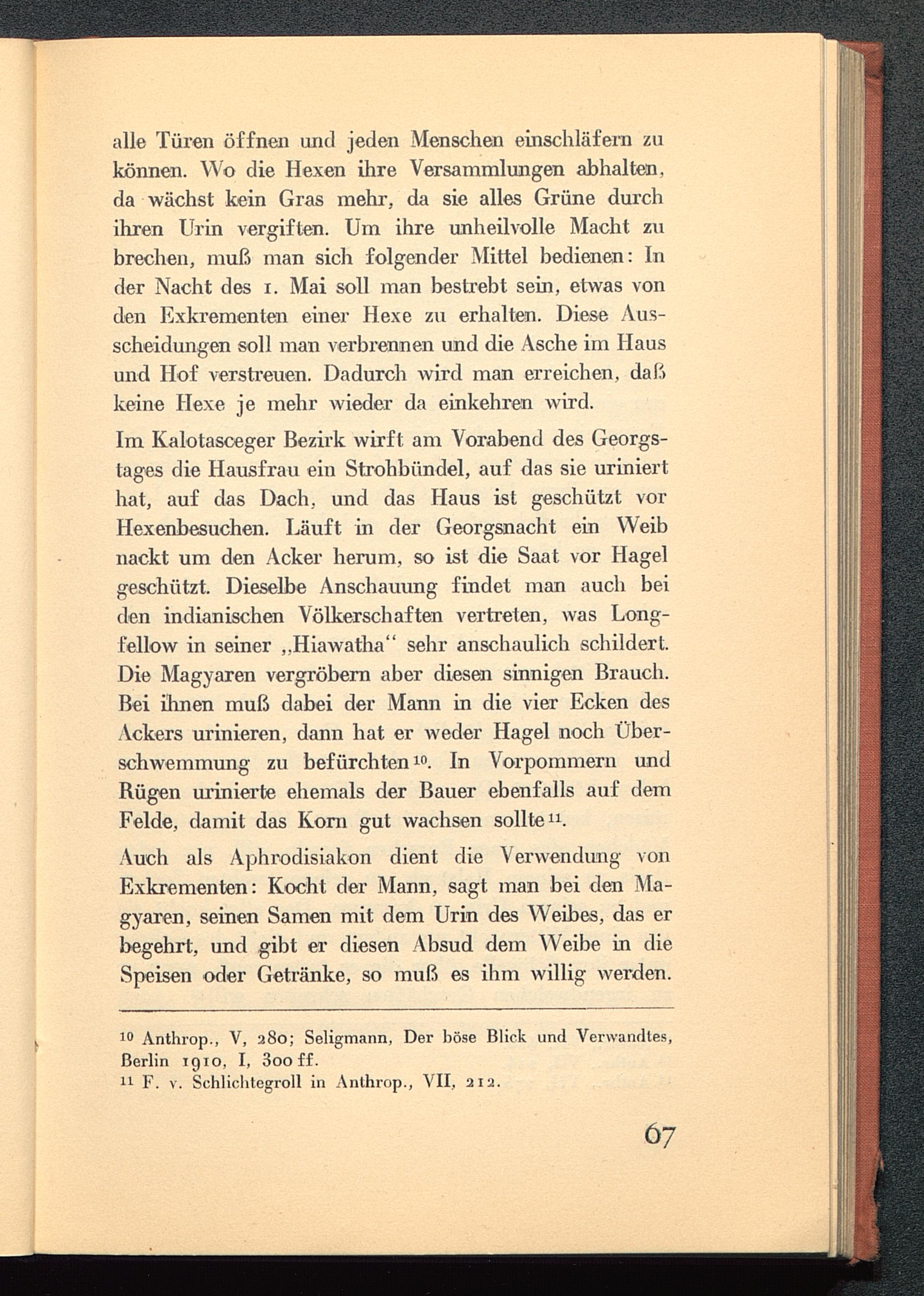 Im Kalotasceger Bezirk wirft am Vorabend des Georgs-tages die Hausfrau ein Strohbündel, auf das sie urinierthat, auf das Dach., und das Haus ist geschützt vorHexenbesuchen. Läuft in der Georgsnacht ein Weibnackt um den Acker herum, so ist die Saat vor Hagelgeschützt. Dieselbe Anschauung findet man auch beiden indianischen Völkerschaften vertreten, was Long-fellow in seiner ,,Hiawatha" sehr anschaulich schildert.Die Magyaren vergröbern aber diesen sinnigen Brauch.Bei ihnen muß dabei der Mann in die vier Ecken desAckers urinieren, dann hat er weder Hagel noch Über-schwemmung zu befürchten 10 . In Vorpommern undBügen urinierte ehemals der Bauer ebenfalls auf demFelde, damit das Korn gut wachsen sollte 11 .