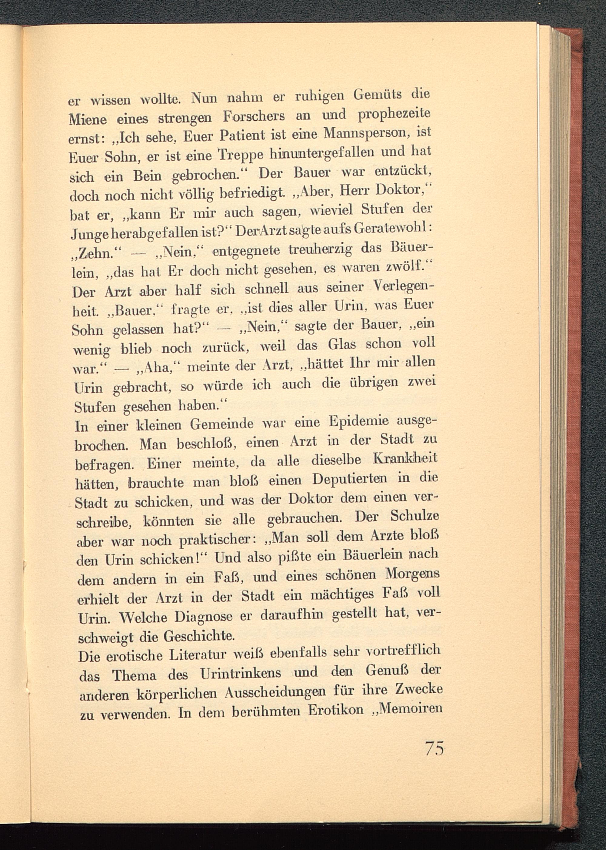 In einer kleinen Gemeinde war eine Epidemie ausge-brochen. Man beschloß, einen Arzt in der Stadt zubefragen. Einer meinte, da alle dieselbe Krankheithätten, brauchte man bloß einen Deputierten in dieStadt zu schicken, und was der Doktor dem einen ver-schreibe, könnten sie alle gebrauchen. Der Schulzeaber war noch praktischer: „Man soll dem Arzte bloßden Urin schicken!" Und also pißte ein Bäuerlein nachdem andern in ein Faß, und eines schönen Morgenserhielt der Arzt in der Stadt ein mächtiges Faß vollUrin. Welche Diagnose er daraufhin gestellt hat, ver-schweigt die Geschichte.
