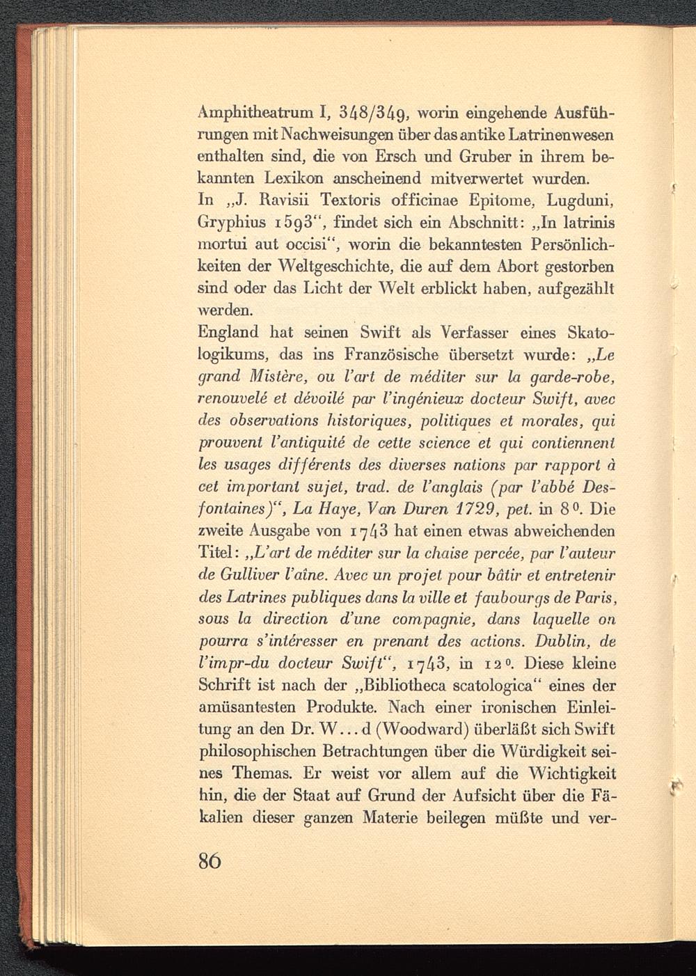 Amphitheatrum I, 348/349, worin eingehende Ausfüh-rungen mit Nachweisungen über das antike Latrinenwesenenthalten sind, die von Ersch und Gruber in ihrem be-kannten Lexikon anscheinend mitverwertet wurden.In „J. Ravisii Textoris officinae Epitome, Lugduni,Gryphius i5g3", findet sich ein Abschnitt: „In latrinismortui aut occisi", worin die bekanntesten Persönlich-keiten der Weltgeschichte, die auf dem Abort gestorbensind oder das Licht der Welt erblickt haben, aufgezähltwerden.