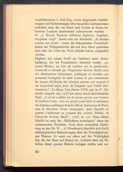 England hat seinen Swift als Verfasser eines Skato-logikums, das ins Französische übersetzt wurde: „hegrand Mister e, ou Varl de mediter sur la garde-robe,renouvele et devoile par l'ingenieux docteur Swift, avecdes observations historiques, politiques et morales, quiprouvent l'antiquite de cette science et qui conliennentles usages differents des diverses nations par rapport äcet important sujet, trad. de l'anglais (par l'abbe Des-fontaines)", La Haje, Van Düren 1729, pet. in 8°. Diezweite Ausgabe von 17 t\ 3 hat einen etwas abweichendenTitel: „L'art de mediter sur la chaise percee, par l'auteurde Gulliver Vaine. Avec un projet pour bätir et entretenirdes iMtrines publiques dans la ville et faubourgs de Paris,sous la direction d'une compagnie, dans laquelle 0.1pourra s'interesser en prenant des actions. Dublin , del'impr-du docteur Swift", 17/^3, in 12". Diese kleineSchrift ist nach der „Bibliotheca scatologica" eines deramüsantesten Produkte. Nach einer ironischen Einlei-tung an den Dr. W... d (Woodward) überläßt sich Swiftphilosophischen Betrachtungen über die Würdigkeit sei-nes Themas. Er weist vor allem auf die Wichtigkeithin, die der Staat auf Grund der Aufsicht über die Fä-kalien dieser ganzen Materie beilegen müßte und ver-