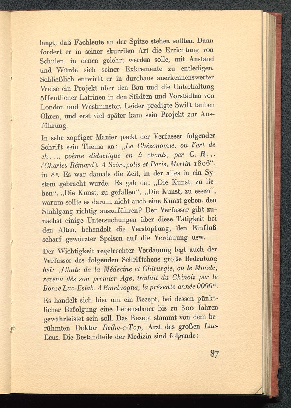 In sehr zopfiger Manier packt der Verfasser folgenderSchrift sein Thema an: „La Chezonomie, ou Varl dech ..., poeme didactique en U chants, par C. R . ,.(Charles Remard). A Scöropolis et Paris , Merlin 1806",in 8°. Es war damals die Zeit, in der alles in ein Sy-stem gebracht wurde. Es gab da: „Die Kunst, zu lie-ben", „Die Kunst, zu gefallen", „Die Kunst, zu essen",warum sollte es darum nicht auch eine Kunst geben, denStuhlgang richtig auszuführen? Der Verfasser gibt zu-nächst einige Untersuchungen über diese Tätigkeit beiden Alten, behandelt die Verstopfung, den Einflußscharf gewürzter Speisen auf die Verdauung usw.
