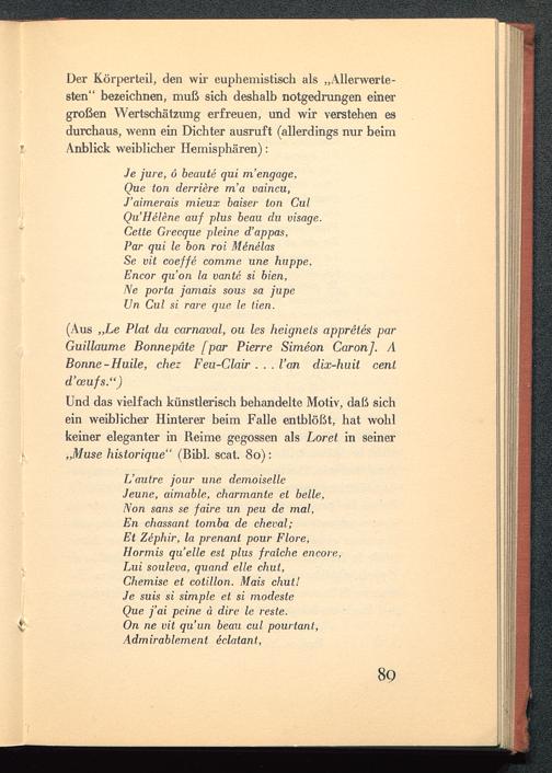 Und das vielfach künstlerisch behandelte Motiv, daß sichein weiblicher Hinterer beim Falle entblößt, hat wohlkeiner eleganter in Reime gegossen als höret in seiner„Muse historique" (Bibl. scat. 80):
