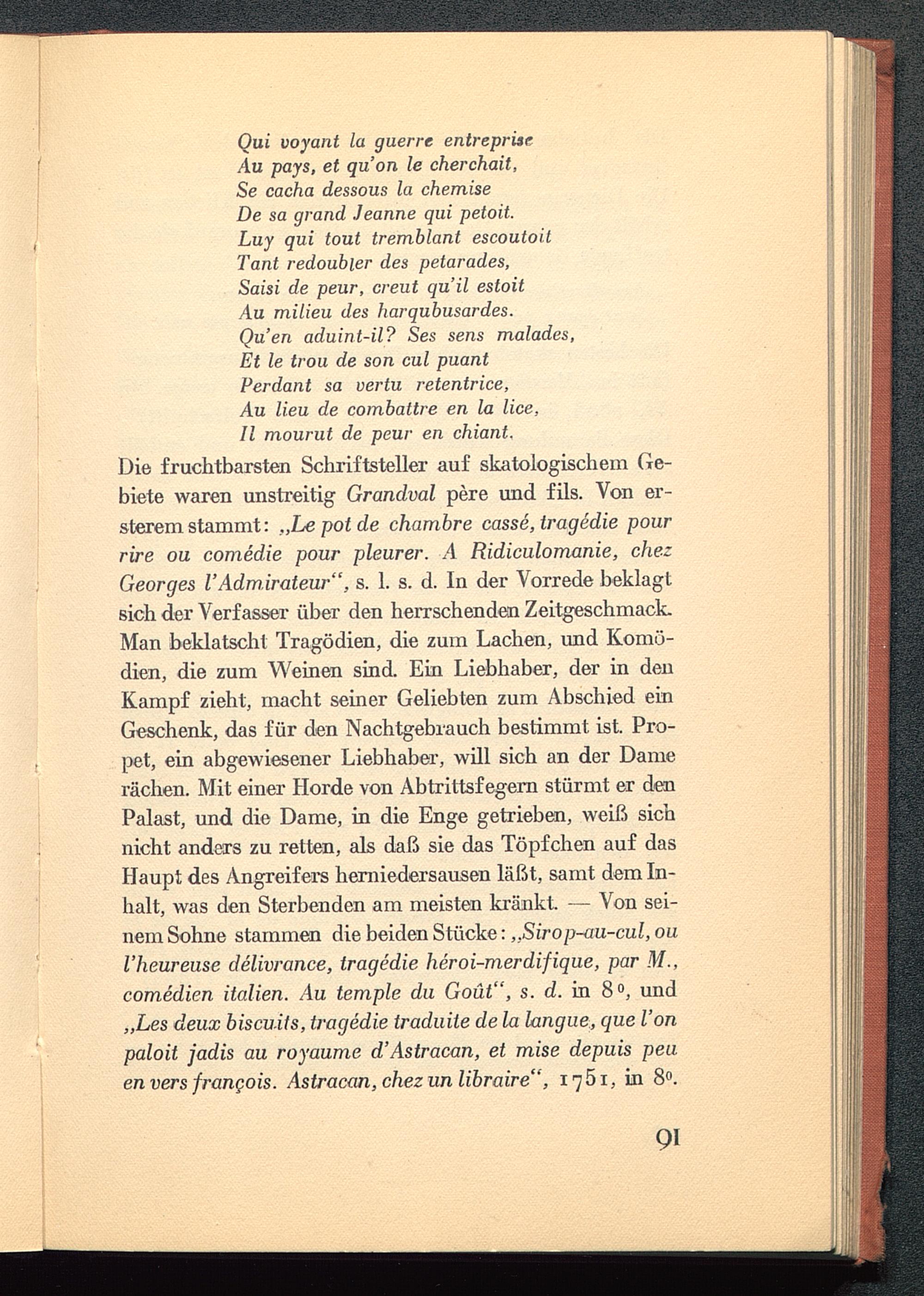 Die fruchtbarsten Schriftsteller auf skatologischem Ge-biete waren unstreitig Grandval pere und fils. Von er-sterem stammt: „Le pot de chambre casse, tragedie pourrire ou comedie pour pleurer. A Ridiculomanie, chezGeorges V Admirateur", s. 1. s. d. In der Vorrede beklagtsich der Verfasser über den herrschenden Zeitgeschmack.Man beklatscht Tragödien, die zum Lachen, und Komö-dien, die zum Weinen sind. Ein Liebhaber, der in denKampf zieht, macht seiner Geliebten zum Abschied einGeschenk, das für den Nachtgebrauch bestimmt ist. Pro-pet, ein abgewiesener Liebhaber, will sich an der Damerächen. Mit einer Horde von Abtrittsfegern stürmt er denPalast, und die Dame, in die Enge getrieben, weiß sichnicht anders zu retten, als daß sie das Töpfchen auf dasHaupt des Angreif ers herniedersausen läßt, samt dem In-halt, was den Sterbenden am meisten kränkt. — Von sei-nem Sohne stammen die beiden Stücke: ,.Sirop-au-cul, ouVheureuse delivrance, tragedie heroi-merdifique, par M.,comedien italien. Au temple du Goüt", s. d. in 8°, und„Les deux biscu.its, tragedie traduile de la langue, que Vonpaloit jadis au royaume d'Astracan, et mise depuis peuenversfrangois. Astracan,chezunlibraire", i7Öi, in 8°.