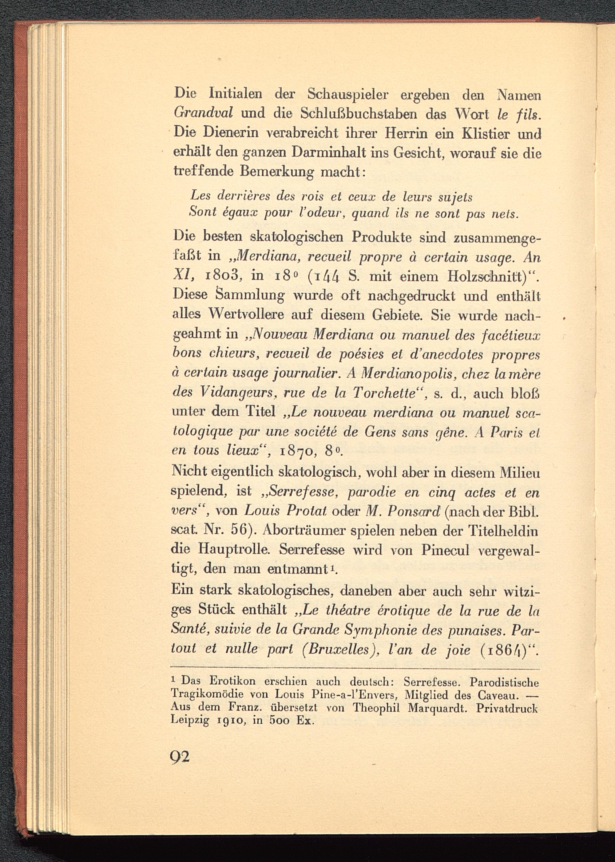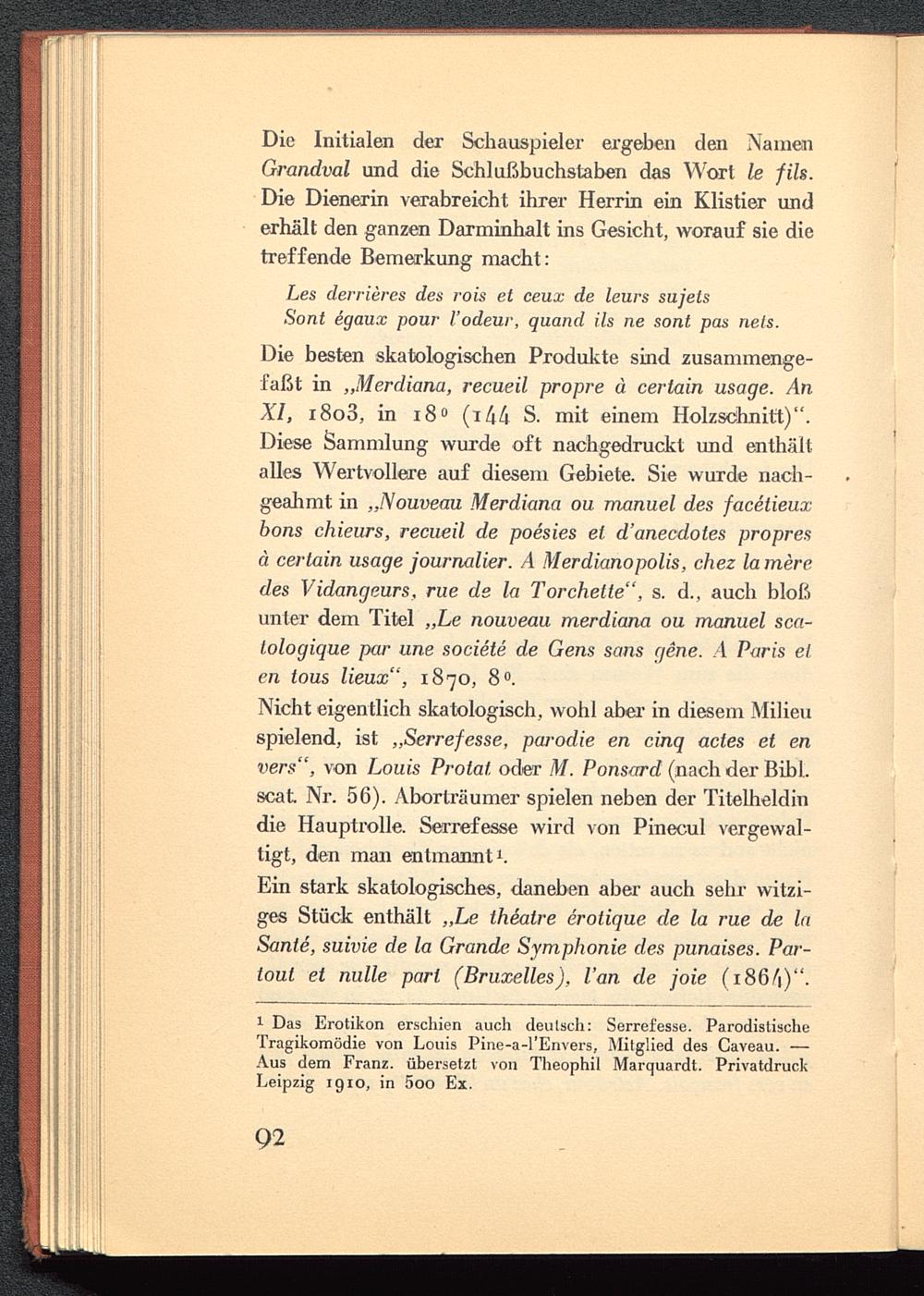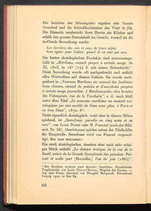 1 Das Erotikon erschien auch deutsch: Serrefesse. ParodistischeTragikomödie von Louis Pine-a-l'Envers, Mitglied des Caveau. —Aus dem Franz. übersetzt von Theophil Marquardt. PrivatdruckLeipzig 1910, in 5oo Ex.