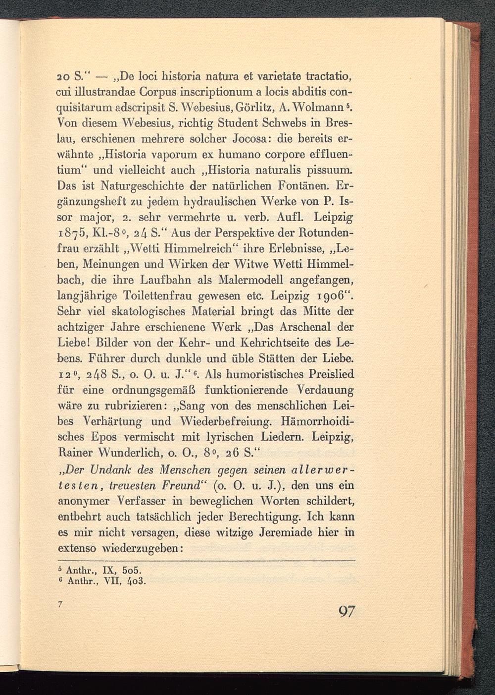 ao S." — „De loci historia natura et varietate tractatio,cui illustrandae Corpus inscriptionum a locis abditis con-quisitarum adscripsit S. Webesius, Görlitz , A. Wolmann 5 .Von diesem Webesius, richtig Student Schwebs in Bres-lau , erschienen mehrere solcher Jocosa: die bereits er-wähnte „Historia vaporum ex humano corpore effluen-tium" und vielleicht auch „Historia naturalis pissuum.Das ist Naturgeschichte der natürlichen Fontänen. Er-gänzungsheft zu jedem hydraulischen Werke von P. Is-sor major, 2. sehr vermehrte u. verb. Aufl. Leipzig 1875, K1.-8 0 , 24 S." Aus der Perspektive der Rotunden-frau erzählt „Wetti Himmelreich" ihre Erlebnisse, „Le-ben, Meinungen und Wirken der Witwe Wetti Himmel-bach, die ihre Laufbahn als Malermodell angefangen,langjährige Toilettenfrau gewesen etc. Leipzig 1906".Sehr viel skatologisches Material bringt das Mitte derachtziger Jahre erschienene Werk „Das Arschenal derLiebe! Bilder von der Kehr- und Kehrichtseite des Le-bens. Führer durch dunkle und üble Stätten der Liebe.12°, 2 1\ 8 S., o. O. u. J." c . Als humoristisches Preisliedfür eine ordnungsgemäß funktionierende Verdauungwäre zu rubrizieren: „Sang von des menschlichen Lei-bes Verhärtung und Wiederbefreiung. Hämorrhoidi-sches Epos vermischt mit lyrischen Liedern. Leipzig ,Rainer Wunderlich, o. 0., 8°, 26 S."„Der Undank des Menschen gegen seinen all er wer-testen, treuesten Freund" (o. 0. u. J.), den uns einanonymer Verfasser in beweglichen Worten schildert,entbehrt auch tatsächlich jeder Berechtigung. Ich kannes mir nicht versagen, diese witzige Jeremiade hier inextenso wiederzugeben: