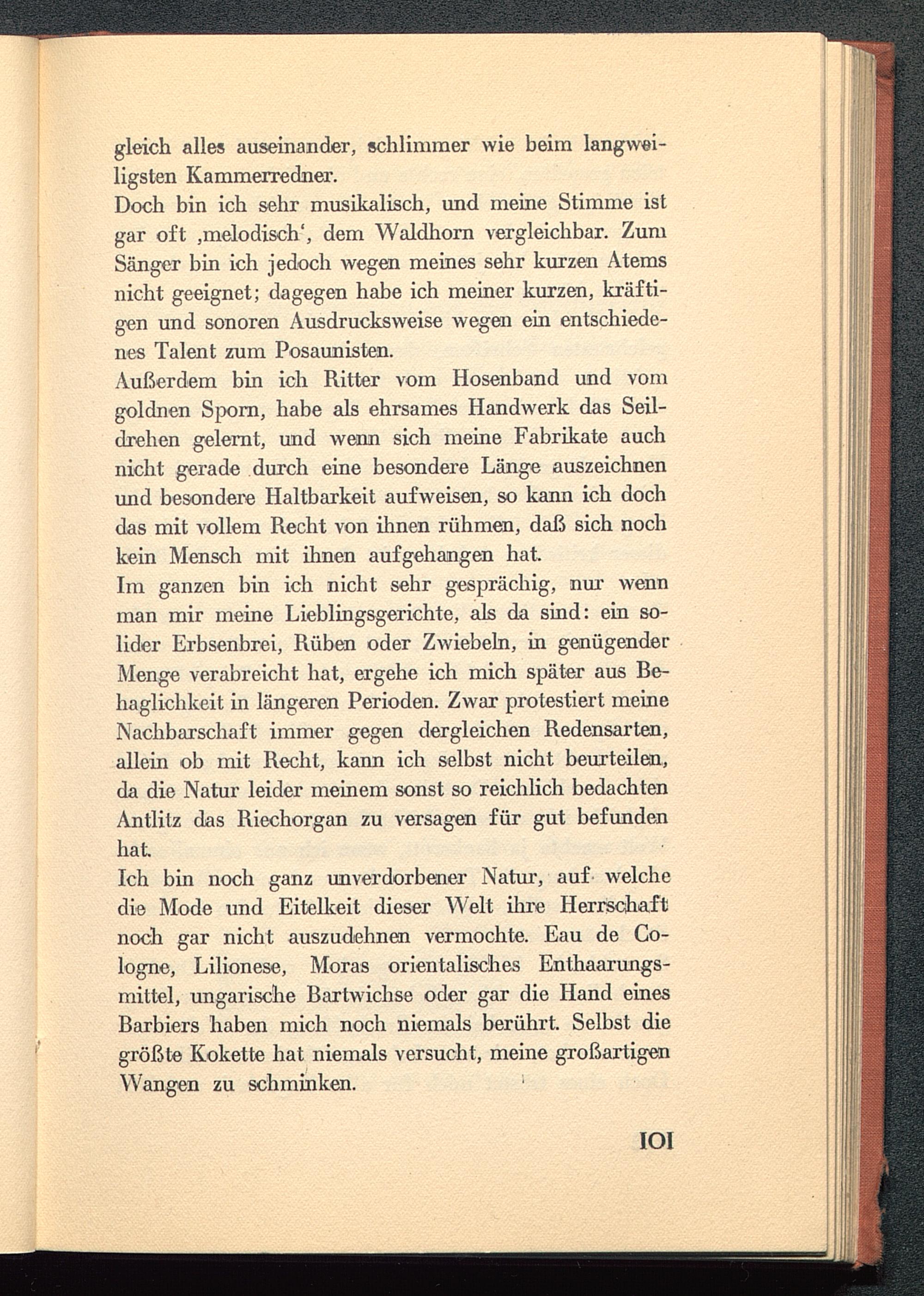 Doch bin ich sehr musikalisch, und meine Stimme istgar oft .melodisch', dem Waldhorn vergleichbar. ZumSänger bin ich jedoch wegen meines sehr kurzen Atemsnicht geeignet; dagegen habe ich meiner kurzen, kräfti-gen und sonoren Ausdrucksweise wegen ein entschiede-nes Talent zum Posaunisten.