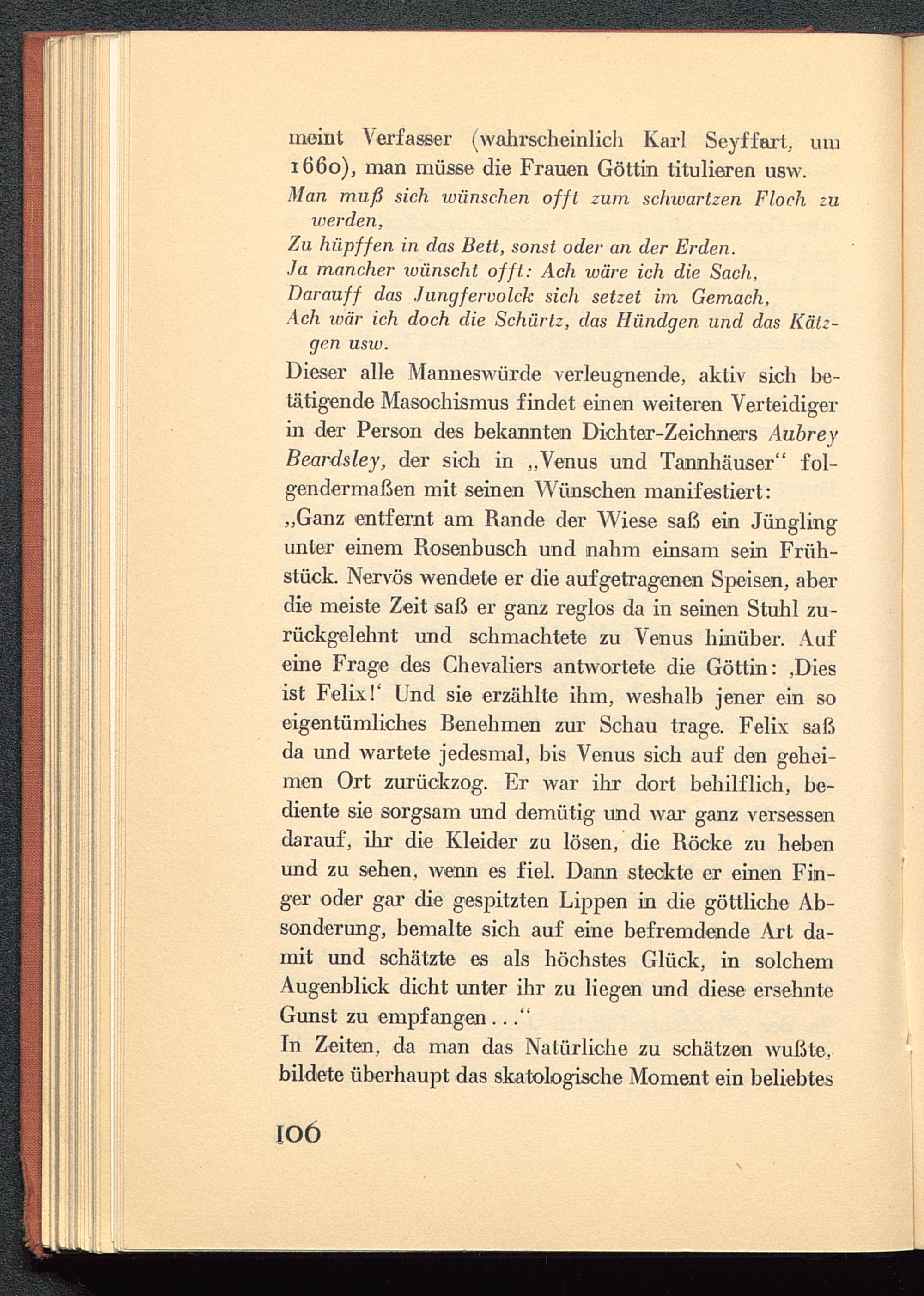 Dieser alle Manneswürde verleugnende, aktiv sich be-tätigende Masochismus findet einen weiteren Verteidigerin der Person des bekannten Dichter-Zeichners AubreyBeardsley , der sich in „Venus und Tannhäuser" fol-gendermaßen mit seinen Wünschen manifestiert:„Ganz entfernt am Rande der Wiese saß ein Jünglingunter einem Rosenbusch und nahm einsam sein Früh-stück. Nervös wendete er die aufgetragenen Speisen, aberdie meiste Zeit saß er ganz reglos da in seinen Stuhl zu-rückgelehnt und schmachtete zu Venus hinüber. Aufeine Frage des Chevaliers antwortete die Göttin: ,Diesist Felix!' Und sie erzählte ihm, weshalb jener ein soeigentümliches Renehmen zur Schau trage. Felix saßda und wartete jedesmal, bis Venus sich auf den gehei-men Ort zurückzog. Er war ihr dort behilflich, be-diente sie sorgsam und demütig und war ganz versessendarauf, ihr die Kleider zu lösen, die Röcke zu hebenund zu sehen, wenn es fiel. Dann steckte er einen Fin-ger oder gar die gespitzten Lippen in die göttliche Ab-sonderung, bemalte sich auf eine befremdende Art da-mit und schätzte es als höchstes Glück, in solchemAugenblick dicht unter ihr zu liegen und diese ersehnteGunst zu empfangen..."