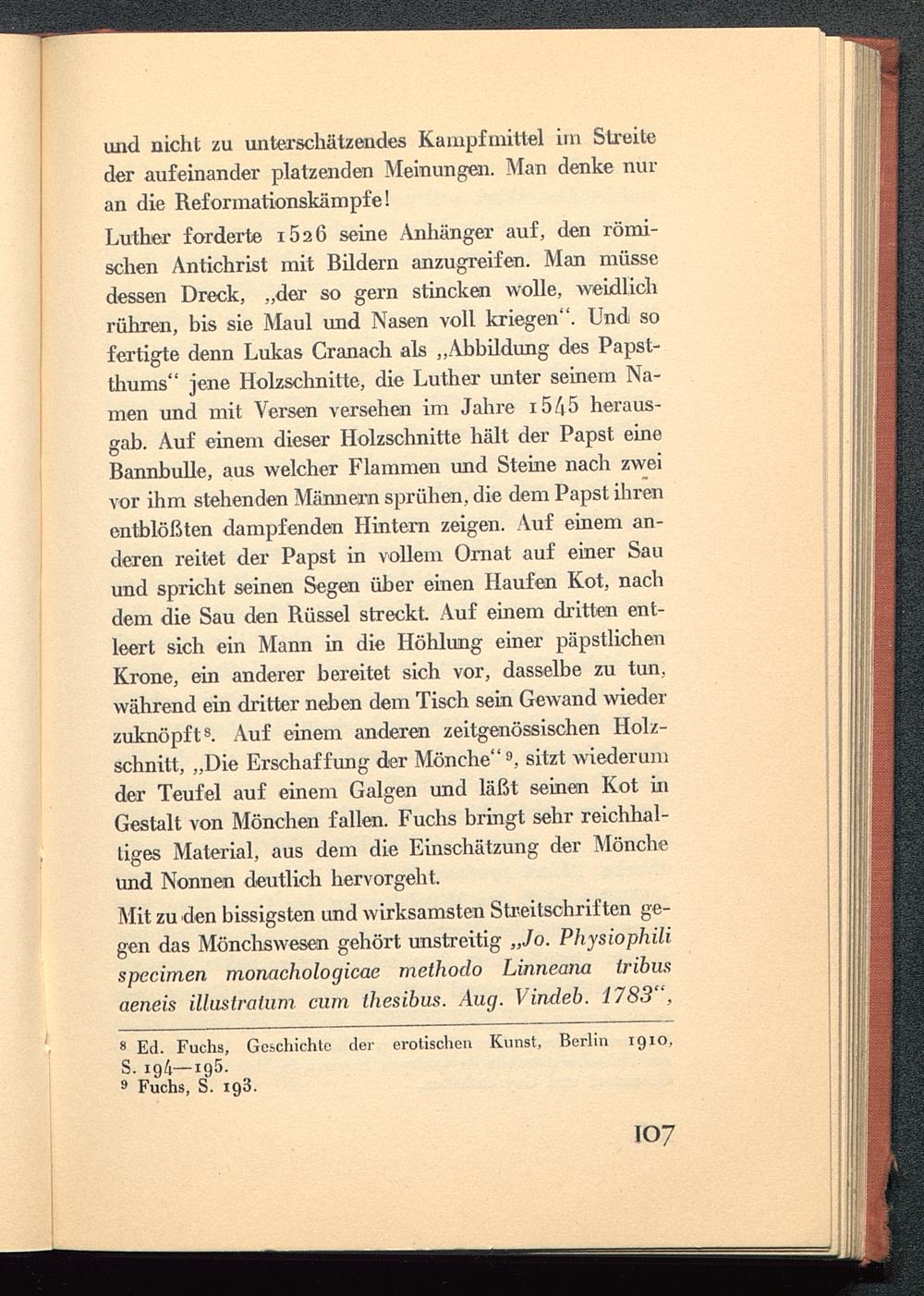 Luther forderte iÖ2 6 seine Anhänger auf, den römi-schen Antichrist mit Bildern anzugreifen. Man müssedessen Dreck, „der so gern stincken wolle, weidlichrühren, bis sie Maul und Nasen voll kriegen". Und sofertigte denn Lukas Cranach als „Abbildung des Papst-thums" jene Holzschnitte, die Luther unter seinem Na-men und mit Versen versehen im Jahre i5/j5 heraus-gab. Auf einem dieser Holzschnitte hält der Papst eineBannbulle, aus welcher Flammen und Steine nach zweivor ihm stehenden Männern sprühen, die dem Papst ihrenentblößten dampfenden Hintern zeigen. Auf einem an-deren reitet der Papst in vollem Ornat auf einer Sauund spricht seinen Segen über einen Haufen Kot, nachdem die Sau den Rüssel streckt Auf einem dritten ent-leert sich ein Mann in die Höhlung einer päpstlichenKrone, ein anderer bereitet sich vor, dasselbe zu tun,während ein dritter neben dem Tisch sein Gewand wiederzuknöpft s . Auf einem anderen zeitgenössischen Holz-schnitt, „Die Erschaffung der Mönche" 9 , sitzt wiederumder Teufel auf einem Galgen und läßt seinen Kot inGestalt von Mönchen fallen. Fuchs bringt sehr reichhal-tiges Material, aus dem die Einschätzung der Möncheund Nonnen deutlich hervorgeht.