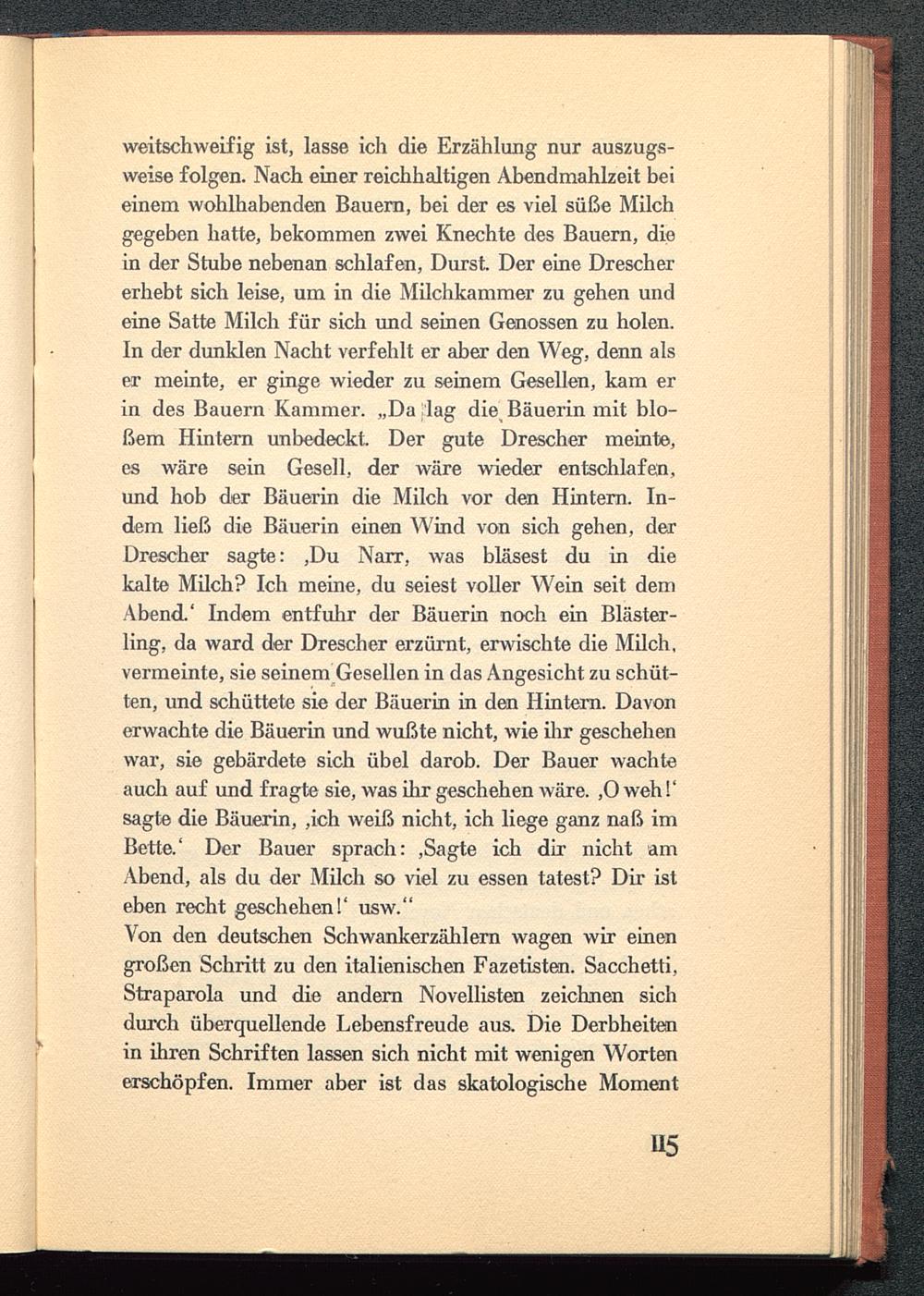Von den deutschen Schwankerzählern wagen wir einengroßen Schritt zu den italienischen Fazetisten. Sacchetti,Straparola und die andern Novellisten zeichnen sichdurch überquellende Lebensfreude aus. Die Derbheitenin ihren Schriften lassen sich nicht mit wenigen Wortenerschöpfen. Immer aber ist das skatologische Moment