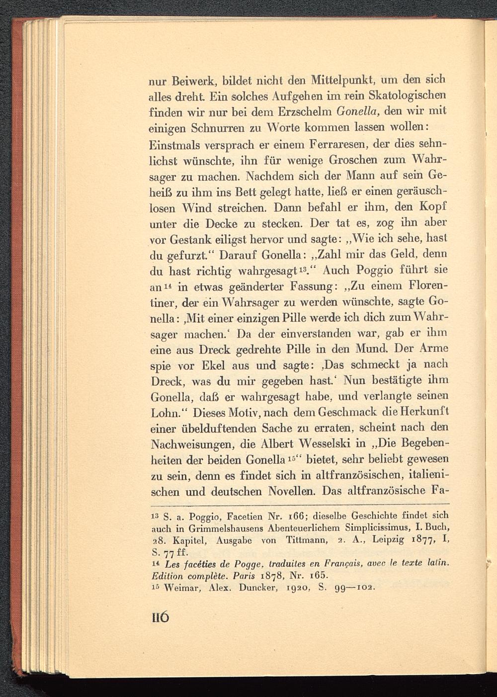 nur Beiwerk, bildet nicht den Mittelpunkt, um den sichalles dreht Ein solches Aufgehen im rein Skate-logischenfinden wir nur bei dem Erzschelm Gonella, den wir miteinigen Schnurren zu Worte kommen lassen wollen:Einstmals versprach er einem Ferraresen, der dies sehn-lichst wünschte, ihn für wenige Groschen zum Wahr-sager zu machen. Nachdem sich der Mann auf sein Ge-heiß zu ihm ins Bett gelegt hatte, ließ er einen geräusch-losen Wind streichen. Dann befahl er ihm, den Kopfunter die Decke zu stecken. Der tat es, zog ihn abervor Gestank eiligst hervor und sagte: „Wie ich sehe, hastdu gefurzt." Darauf Gonella: „Zahl mir das Geld, denndu hast richtig wahrgesagt 13 ." Auch Poggio führt siean 14 in etwas geänderter Fassung: „Zu einem Floren-tiner, der ein Wahrsager zu werden wünschte, sagte Go-nella : ,Mit einer einzigen Pille werde ich dich zum Wahr-sager machen.' Da der einverstanden war, gab er ihmeine aus Dreck gedrehte Pille in den Mund. Der Armespie vor Ekel aus und sagte: ,Das schmeckt ja nachDreck, was du mir gegeben hast.' Nun bestätigte ihmGonella, daß er wahrgesagt habe, und verlangte seinenLohn." Dieses Motiv, nach dem Geschmack die Herkunfteiner übelduftenden Sache zu erraten, scheint nach denNachweisungen, die Albert Wesselski in „Die Begeben-heiten der beiden Gonella 15 " bietet, sehr beliebt gewesenzu sein, denn es findet sich in altfranzösischen, italieni-schen und deutschen Novellen. Das altfranzösische Fa-