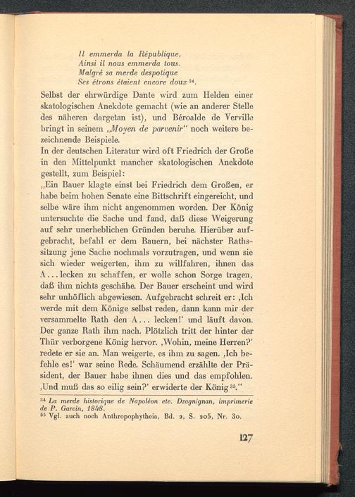 „Ein Bauer klagte einst bei Friedrich dem Großen, erhabe beim hohen Senate eine Bittschrift eingereicht, undselbe wäre ihm nicht angenommen worden. Der Königuntersuchte die Sache und fand, daß diese Weigerungauf sehr unerheblichen Gründen beruhe. Hierüber auf-gebracht, befahl er dem Bauern, bei nächster Baths-sitzung jene Sache nochmals vorzutragen, und wenn siesich wieder weigerten, ihm zu willfahren, ihnen dasA... lecken zu schaffen, er wolle schon Sorge tragen,daß ihm nichts geschähe. Der Bauer erscheint und wirdsehr unhöflich abgewiesen. Aufgebracht schreit er: ,Ichwerde mit dem Könige selbst reden, dann kann mir derversammelte Bath den A... lecken!' und läuft davon.Der ganze Bath ihm nach. Plötzlich tritt der hinter derThür verborgene König hervor. ,Wohin, meine Herren?'redete er sie an. Man weigerte, es ihm zu sagen. ,Ich be-fehle es!' war seine Bede. Schäumend erzählte der Prä-sident, der Bauer habe ihnen dies und das empfohlen.,Und muß das so eilig sein?' erwiderte der König 35 ."