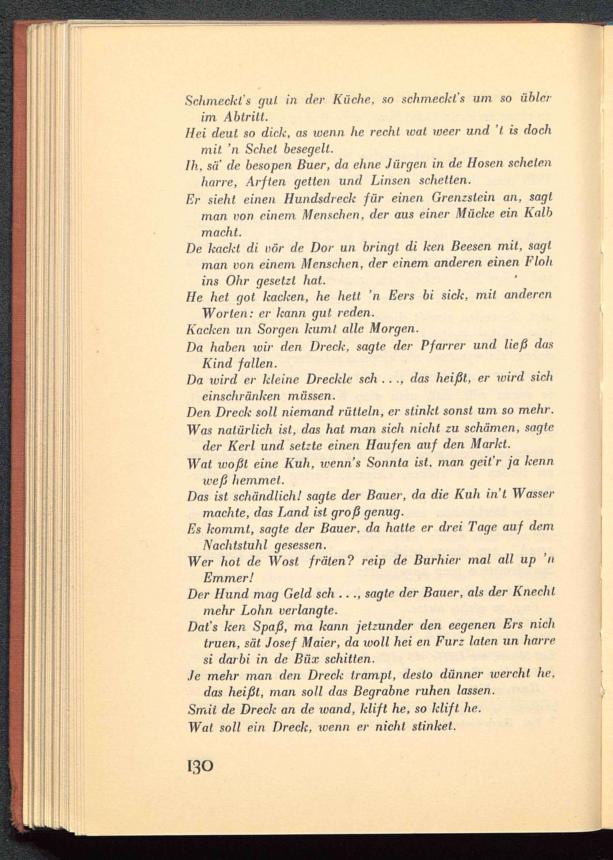 das heißt, man soll das Begrabne ruhen lassen.Smit de Dreck an de wand, klift he, so klift he.Wat soll ein Dreck, ivenn er nicht stinket.