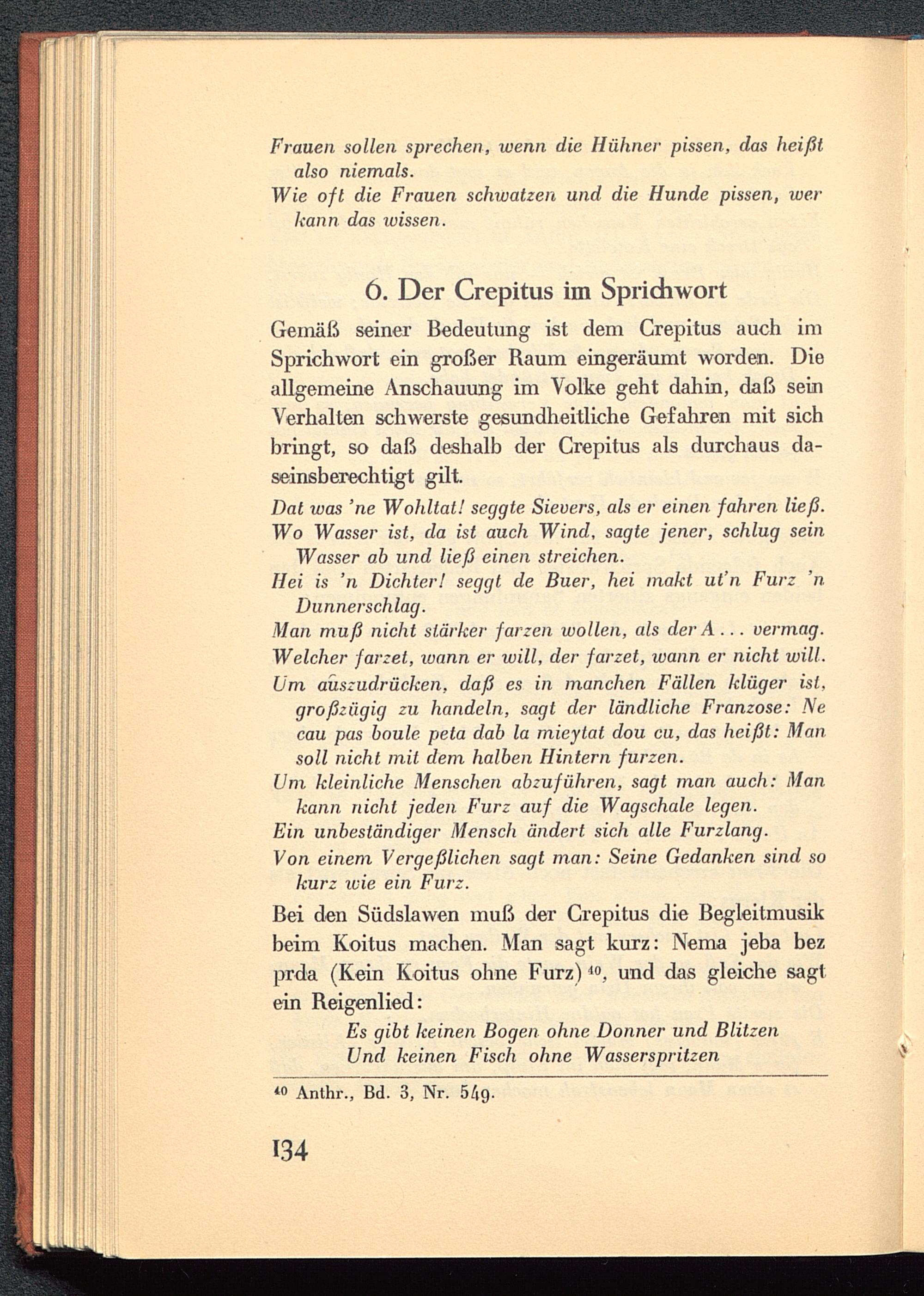 Bei den Südslawen muß der Crepitus die Begleitmusikbeim Koitus machen. Man sagt kurz: Nema jeba bezprda (Kein Koitus ohne Furz) 40 , und das gleiche sagtein Reigenlied:
