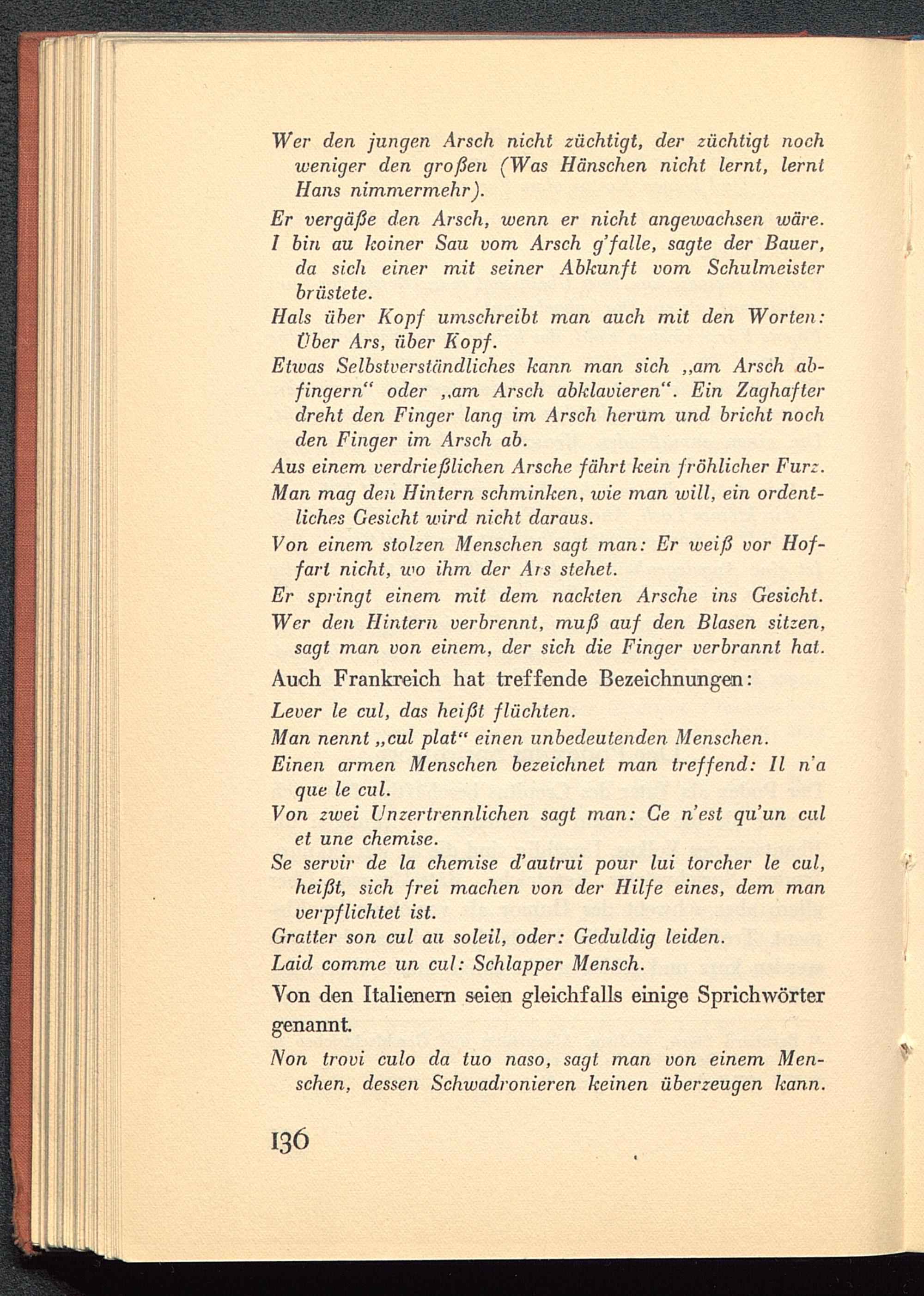 verpflichtet ist.Gratter son cul au soleil, oder: Geduldig leiden.Laid comme un cul: Schlapper Mensch.Von den Italienern seien gleichfalls einige Sprichwörtergenannt.