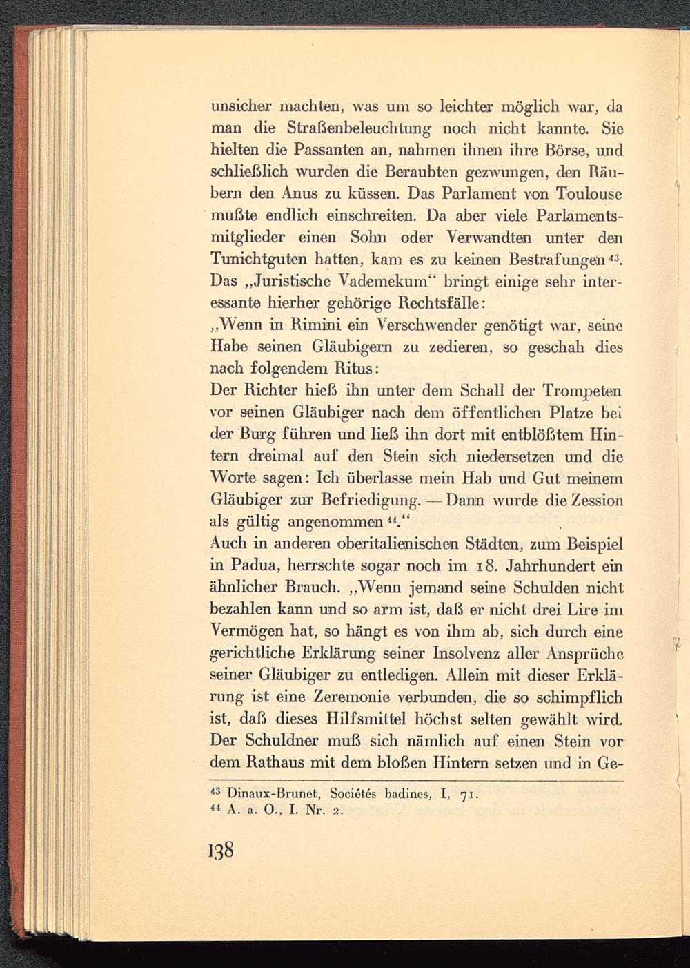 unsicher machten, was um so leichter möglich war, daman die Straßenbeleuchtung noch nicht kannte. Siehielten die Passanten an, nahmen ihnen ihre Börse, undschließlich wurden die Beraubten gezwungen, den Räu-bern den Anus zu küssen. Das Parlament von Toulouse mußte endlich einschreiten. Da aber viele Parlaments-mitglieder einen Sohn oder Verwandten unter denTunichtguten hatten, kam es zu keinen Bestrafungen 43 .Das „Juristische Vademekum" bringt einige sehr inter-essante hierher gehörige Rechtsfälle:„Wenn in Rimini ein Verschwender genötigt war, seineHabe seinen Gläubigern zu zedieren, so geschah diesnach folgendem Ritus: