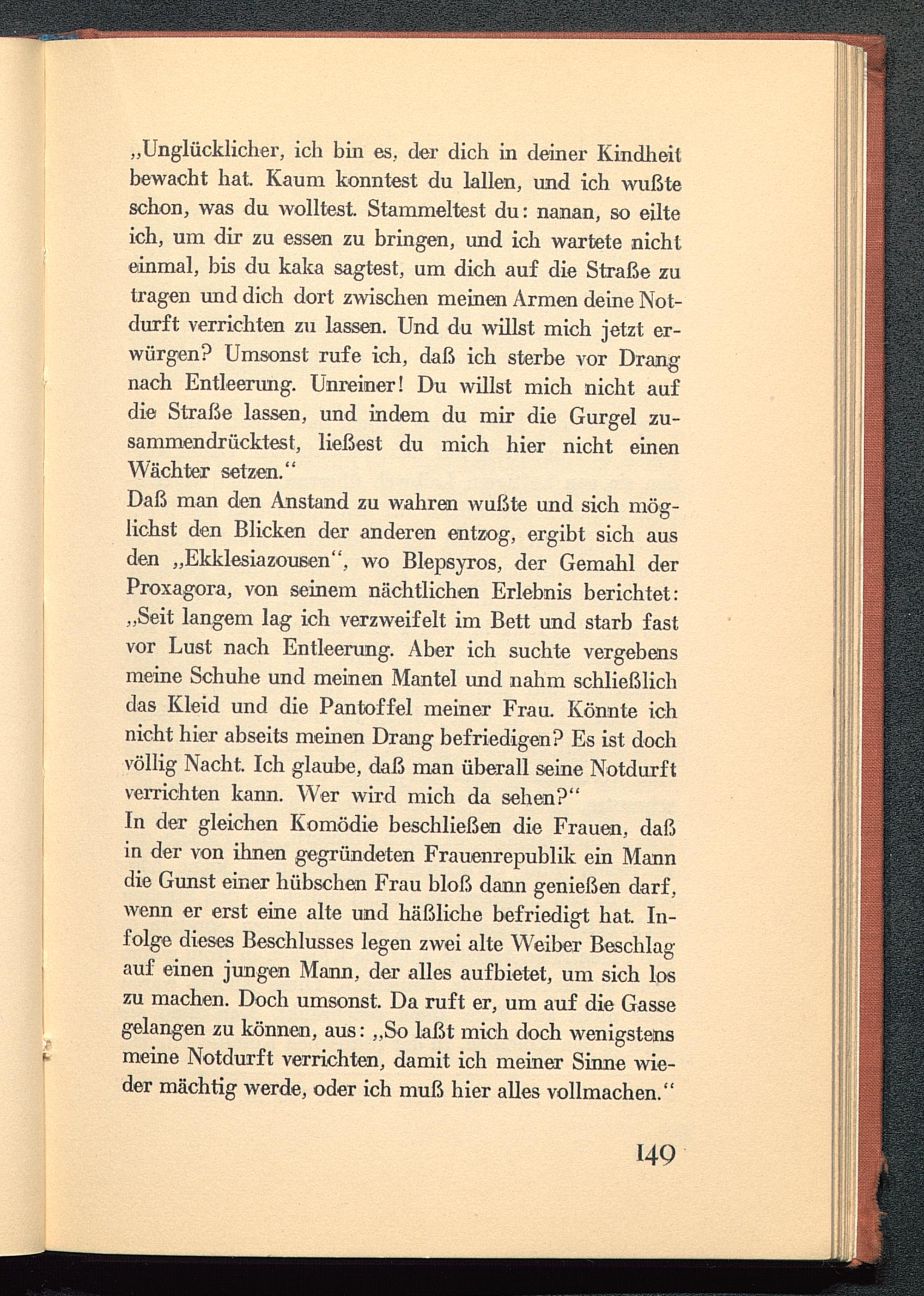Daß man den Anstand zu wahren wußte und sich mög-lichst den Blicken der anderen entzog, ergibt sich ausden „Ekklesiazoußen", wo Blepsyros, der Gemahl derProxagora, von seinem nächtlichen Erlebnis berichtet:„Seit langem lag ich verzweifelt im Bett und starb fastvor Lust nach Entleerung. Aber ich suchte vergebensmeine Schuhe und meinen Mantel und nahm schließlichdas Kleid und die Pantoffel meiner Frau. Könnte ichnicht hier abseits meinen Drang befriedigen? Es ist dochvöllig Nacht. Ich glaube, daß man überall seine Notdurftverrichten kann. Wer wird mich da sehen?"In der gleichen Komödie beschließen die Frauen, daßin der von ihnen gegründeten Frauenrepublik ein Manndie Gunst einer hübschen Frau bloß dann genießen darf ,wenn er erst eine alte und häßliche befriedigt hat In-folge dieses Beschlusses legen zwei alte Weiber Beschlagauf einen jungen Mann, der alles aufbietet, um sich loszu machen. Doch umsonst. Da ruft er, um auf die Gassegelangen zu können, aus: „So laßt mich doch wenigstensmeine Notdurft verrichten, damit ich meiner Sinne wie-der mächtig werde, oder ich muß hier alles vollmachen."