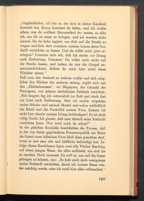 „Unglücklicher, ich bin es, der dich in deiner Kindheilbewacht hat Kaum konntest du lallen, und ich wußteschon, was du wolltest Stammeltest du: nanan, so eilteich, um dir zu essen zu bringen, und ich wartete nichteinmal, bis du kaka sagtest, um dich auf die Straße zutragen und dich dort zwischen meinen Armen deine Not-durft verrichten zu lassen. Und du willst mich jetzt er-würgen? Umsonst rufe ich, daß ich sterbe vor Drangnach Entleerung. Unreiner! Du willst mich nicht aufdie Straße lassen, und indem du mir die Gurgel zu-sammendrücktest, ließest du mich hier nicht einenWächter setzen."