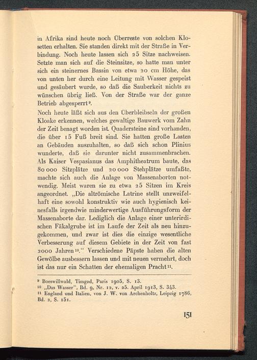 in Afrika sind heute noch Überreste von solchen Klo-setten erhalten. Sie standen direkt mit der Straße in Ver-bindung. Noch heute lassen sich 2 5 Sitze nachweisen.Setzte man sich auf die Steinsitze, so hatte man untersich ein steinernes Bassin von etwa 20 cm Höhe, dasvon unten her durch eine Leitung mit Wasser gespeistund gesäubert wurde, so daß die Sauberkeit nichts zuwünschen übrig ließ. Von der Straße war der ganzeBetrieb abgesperrt 9 .