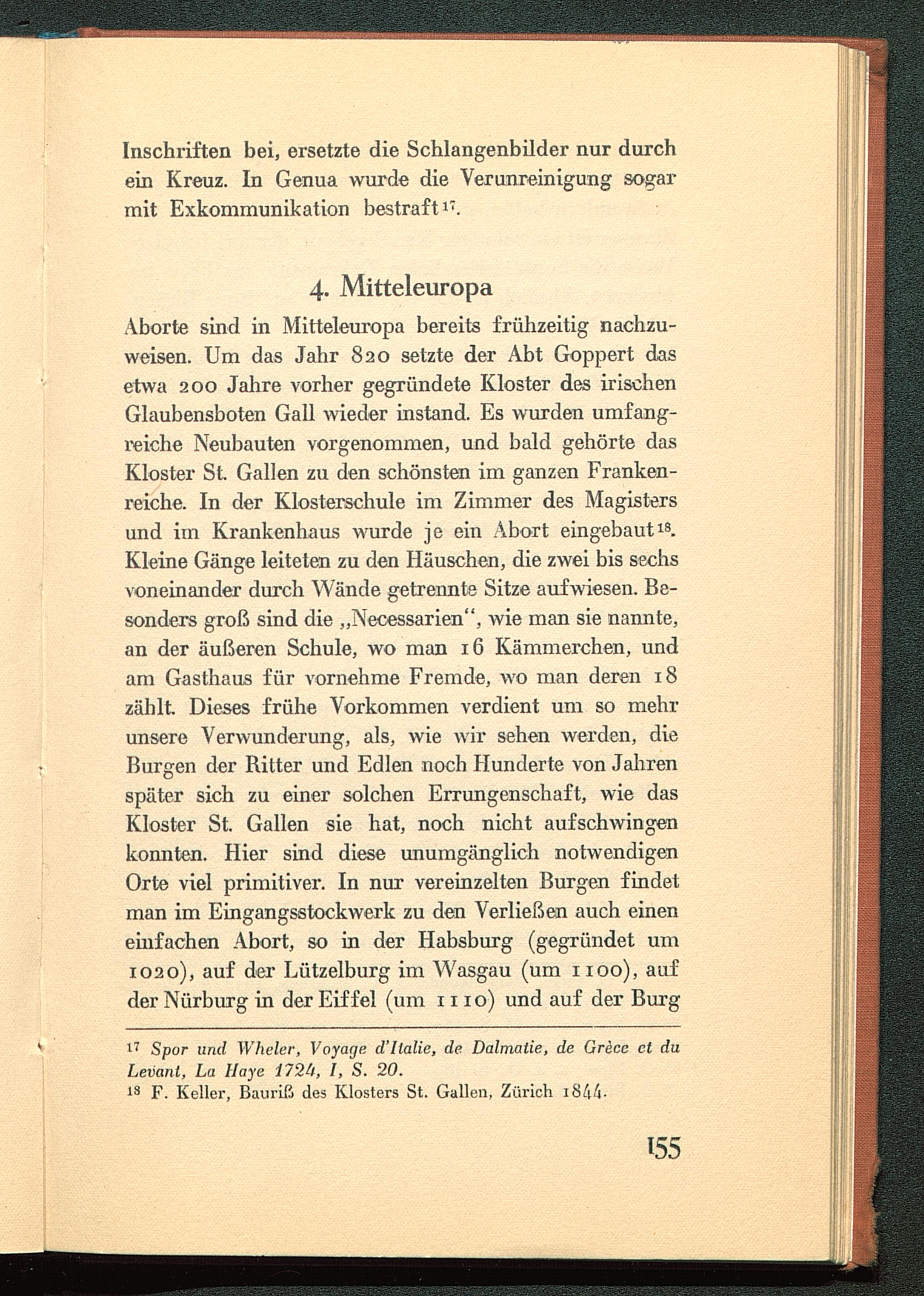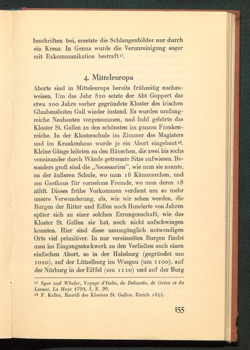Aborte sind in Mitteleuropa bereits frühzeitig nachzu-weisen. Um das Jahr 820 setzte der Abt Goppert dasetwa 200 Jahre vorher gegründete Kloster des irischenGlaubensboten Gall wieder instand. Es wurden umfang-reiche Neubauten vorgenommen, und bald gehörte dasKloster St. Gallen zu den schönsten im ganzen Franken-reiche. In der Klosterschule im Zimmer des Magistersund im Krankenhaus wurde je ein Abort eingebaut 18 .Kleine Gänge leiteten zu den Häuschen, die zwei bis sechsvoneinander durch Wände getrennte Sitze aufwiesen. Be-sonders groß sind die „Necessarien", wie man sie nannte,an der äußeren Schule, wo man 16 Kämmerchen, undam Gasthaus für vornehme Fremde, wo man deren 18zählt Dieses frühe Vorkommen verdient um so mehrunsere Verwunderung, als, wie wir sehen werden, dieBurgen der Bitter und Edlen noch Hunderte von Jahrenspäter sich zu einer solchen Errungenschaft, wie dasKloster St. Gallen sie hat, noch nicht aufschwingenkonnten. Hier sind diese unumgänglich notwendigenOrte viel primitiver. In nur vereinzelten Burgen findetman im Eingangsstockwerk zu den Verließen auch eineneinfachen Abort, so in der Habsburg (gegründet um1020), auf der Lützelburg im Wasgau (um 1100), aufder Nürburg in der Eiffel (um 1110) und auf der Burg