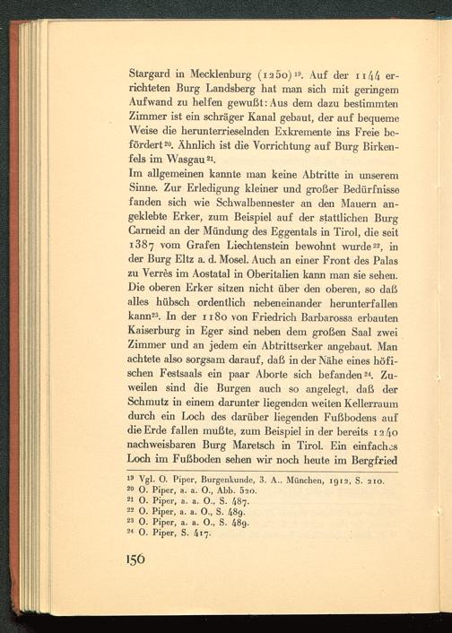 Stargard in Mecklenburg (ia5o) 15 . Auf der n44 er-richteten Burg Landsberg hat man sich mit geringemAufwand zu helfen gewußt: Aus dem dazu bestimmtenZimmer ist ein schräger Kanal gebaut, der auf bequemeWeise die herunterrieselnden Exkremente ins Freie be-fördert 20 . Ähnlich ist die Vorrichtung auf Burg Birken-fels im Wasgau 21 .