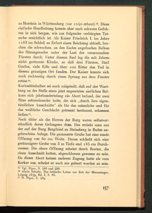 Kuriositätshalber sei noch mitgeteilt, daß auf der Wart-burg an der Stelle eines jetzt angesetzten zierlichen Bal-kons sich jahrhundertelang ein Abort befand, der zweiSitze nebeneinander hatte, die sich „durch ihre eigen-tümlichen Ausschnitte" als für das männliche und fürdas weibliche Geschlecht getrennt bestimmt, erkennenließen 27 .