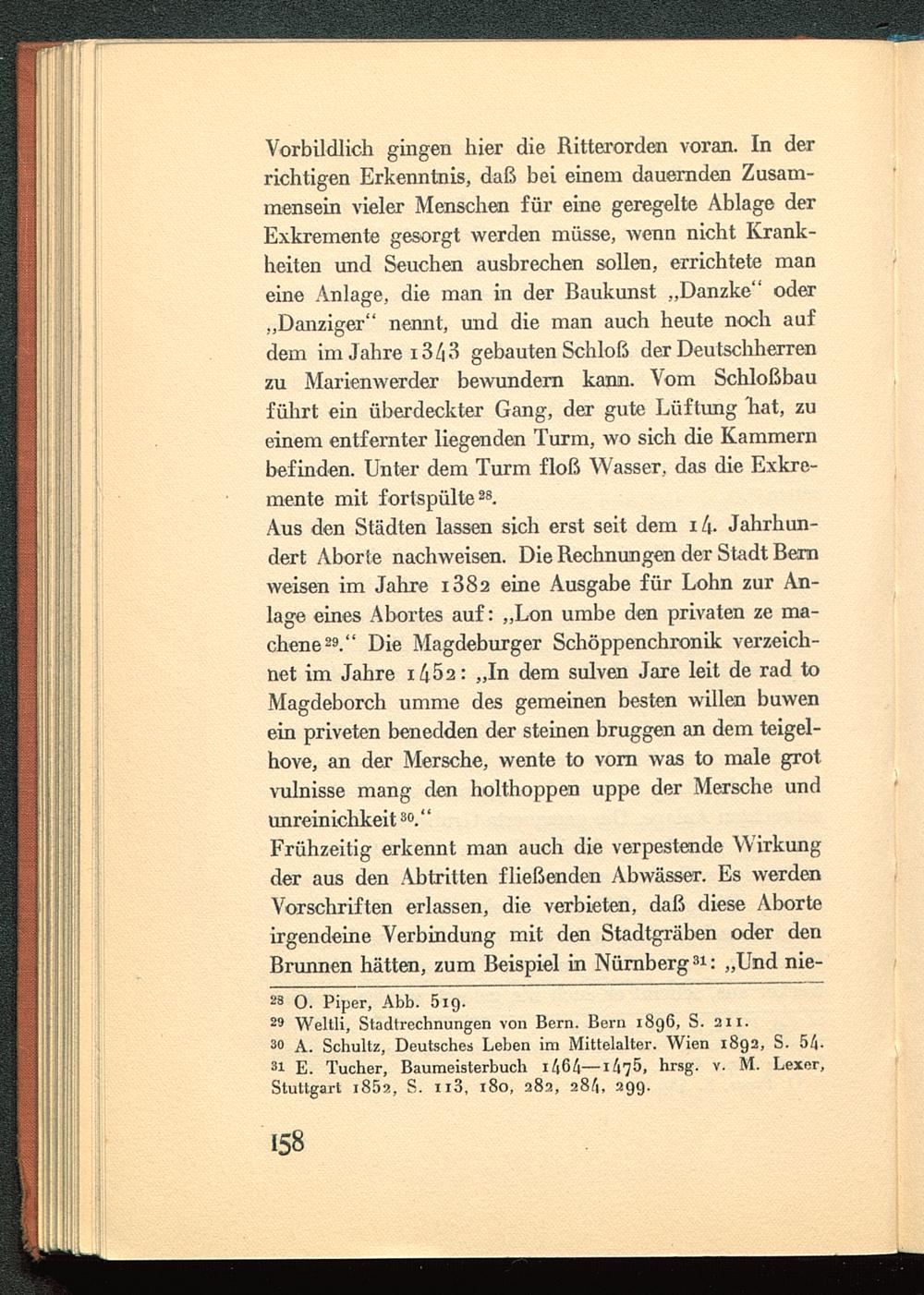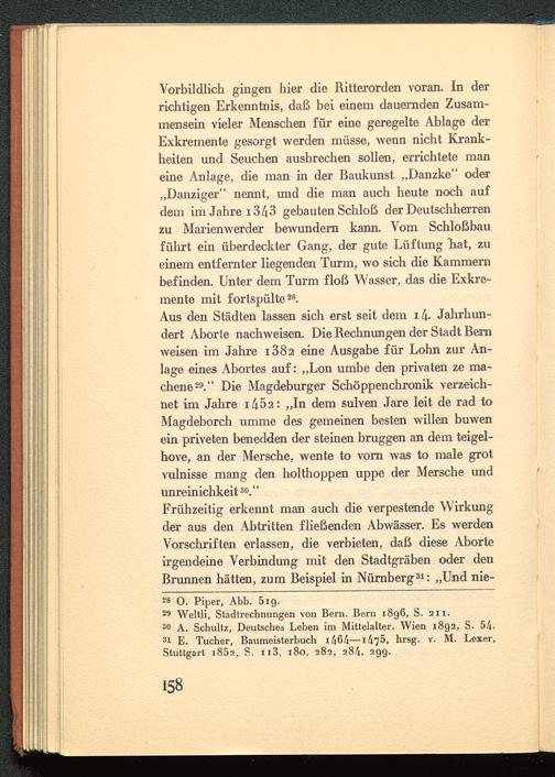 Aus den Städten lassen sich erst seit dem i/i- Jahrhun-dert Aborte nachweisen. Die Rechnungen der Stadt Bern weisen im Jahre i382 eine Ausgabe für Lohn zur An-lage eines Abortes auf: „Lon umbe den privaten ze ma-chene 29 ." Die Magdeburger Schöppenchronik verzeich-net im Jahre i/i52: „In dem sulven Jare leit de rad toMagdeborch umme des gemeinen besten willen buwenein priveten benedden der steinen bruggen an dem teigel-hove, an der Mersche, wente to vorn was to male grotvulnisse mang den holthoppen uppe der Mersche undunreinichkeit 30 ."