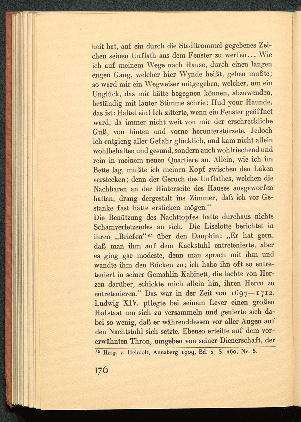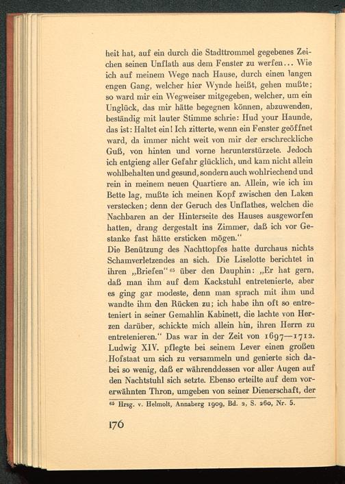 heit hat, auf ein durch die Stadttrommel gegebenes Zei-chen seinen Unflath aus dem Fenster zu werfen... Wieich auf meinem Wege nach Hause, durch einen langenengen Gang, welcher hier Wynde heißt, gehen mußte;so ward mir ein Wegweiser mitgegeben, welcher, um einUnglück, das mir hätte begegnen können, abzuwenden,beständig mit lauter Stimme schrie: Hud your Haunde,das ist: Haltet ein! Ich zitterte, wenn ein Fenster geöffnetward, da immer nicht weit von mir der erschrecklicheGuß, von hinten und vorne herunterstürzete. Jedochich entgieng aller Gefahr glücklich, und kam nicht alleinwohlbehalten und gesund, sondern auch wohlriechend undrein in meinem neuen Quartiere an. Allein, wie ich imBette lag, mußte ich meinen Kopf zwischen den Lakenverstecken; denn der Geruch des Unflathes, welchen dieNachbaren an der Hinterseite des Hauses ausgeworfenhatten, drang dergestalt ins Zimmer, daß ich vor Ge-stanke fast hätte ersticken mögen."Die Benützung des Nachttopfes hatte durchaus nichtsSchamverletzendes an sich. Die Liselotte berichtet inihren „Briefen" 65 über den Dauphin: „Er hat gern,daß man ihm auf dem Kackstuhl entretenierte, aberes ging gar modeste, denn man sprach mit ihm undwandte ihm den Rücken zu; ich habe ihn oft so entre-tenierl in seiner Gemahlin Kabinett, die lachte von Her-zen darüber, schickte mich allein hin, ihren Herrn zuentretenieren." Das war in der Zeit von 1697—17 12 -Ludwig XIV. pflegte bei seinem Lever einen großenHofstaat um sich zu versammeln und genierte sich da-bei so wenig, daß er währenddessen vor aller Augen aufden Nachtstuhl sich setzte. Ebenso erteilte auf dem vor-erwähnten Thron, umgeben von seiner Dienerschaft, der65 Hrsg. v. Helraolt, Annaberg 1909, Bd. a, S. a6o, Nr. 5.