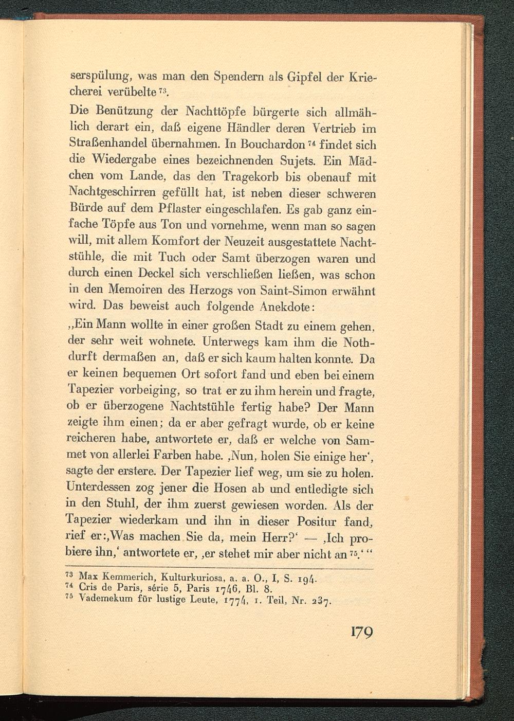 Die Benützung der Nachttöpfe bürgerte sich allmäh-lich derart ein, daß eigene Händler deren Vertrieb imStraßenhandel übernahmen. In Bouchardon 74 findet sichdie Wiedergabe eines bezeichnenden Sujets. Ein Mäd-chen vom Lande, das den Tragekorb bis obenauf mitNachtgeschirren gefüllt hat, ist neben dieser schwerenBürde auf dem Pflaster eingeschlafen. Es gab ganz ein-fache Töpfe aus Ton und vornehme, wenn man so sagenwill, mit allem Komfort der Neuzeit ausgestattete Nacht-stühle, die mit Tuch oder Samt überzogen waren unddurch einen Deckel sich verschließen ließen, was schonin den Memoiren des Herzogs von Saint-Simon erwähntwird. Das beweist auch folgende Anekdote:„Ein Mann wollte in einer großen Stadt zu einem gehen,der sehr weit wohnete. Unterwegs kam ihm die Noth-durft dermaßen an, daß er sich kaum halten konnte. Daer keinen bequemen Ort sofort fand und eben bei einemTapezier vorbeiging, so trat er zu ihm herein und fragte,ob er überzogene Nachtstühle fertig habe? Der Mannzeigte ihm einen; da er aber gefragt wurde, ob er keinereicheren habe, antwortete er, daß er welche von Sam-met von allerlei Farben habe. ,Nun, holen Sie einige her',sagte der erstere. Der Tapezier lief weg, um sie zu holen.Unterdessen zog jener die Hosen ab und entledigte sichin den Stuhl, der ihm zuerst gewiesen worden. Als derTapezier wiederkam und ihn in dieser Positur fandjrief er:,Was machen Sie da, mein Herr?' — ,Ich pro-biere ihn,' antwortete er, ,er stehet mir aber nicht an 75 .' "
