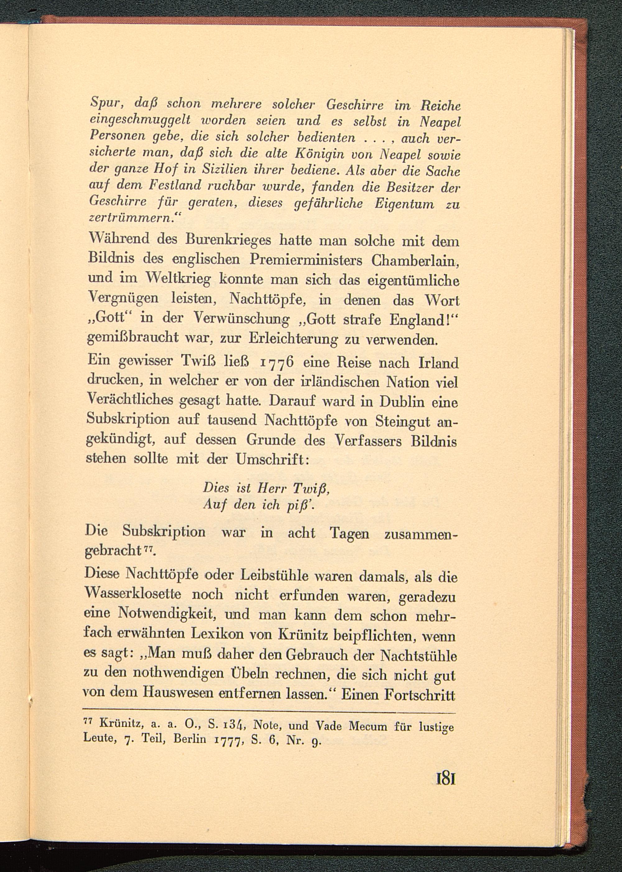 Ein gewisser Twiß ließ 1776 eine Reise nach Irland drucken, in welcher er von der irländischen Nation vielVerächtliches gesagt hatte. Darauf ward in Dublin eineSubskription auf tausend Nachttöpfe von Steingut an-gekündigt, auf dessen Grunde des Verfassers Bildnisstehen sollte mit der Umschrift: