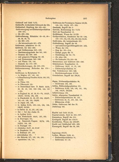 Geldstoff und Geld 71/72.Geldstoffe, wechselnder Gebrauch der 365.Geldumlauf, Eegelung des 438—441.Geld Versorgung und Edelmetalproduktion499—501.