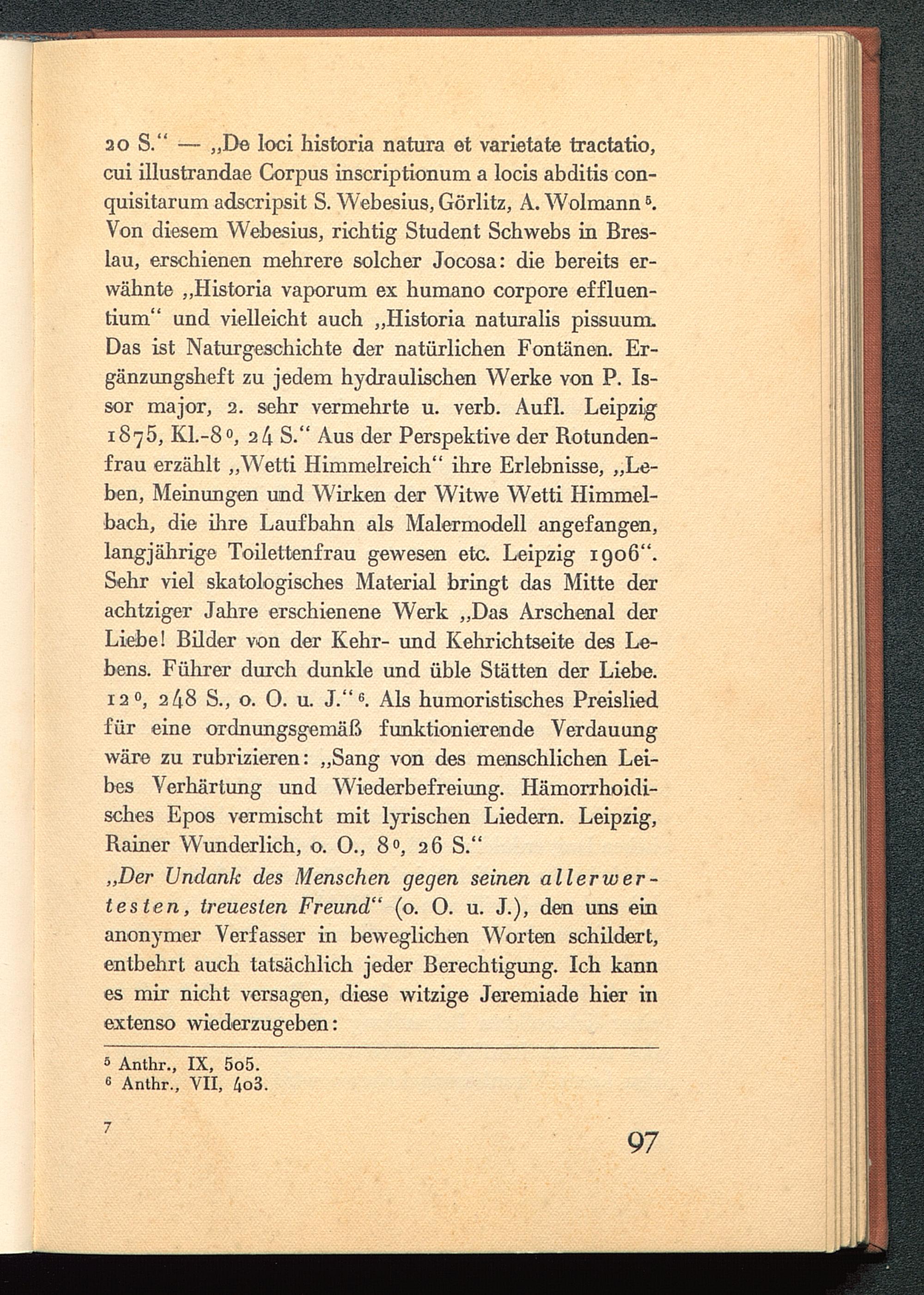 so S." — „De loci historia natura et varietate tractatio,cui illustrandae Corpus inscriptionum a locis abditis con-quisitarum adscripsit S. Webesius, Görlitz , A. Wolmann 6 .Von diesem Webesius, richtig Student Schwebs in Bres-lau , erschienen mehrere solcher Jocosa: die bereits er-wähnte „Historia vaporum ex humano corpore effluen-tium" und vielleicht auch „Historia naturalis pissuum.Das ist Naturgeschichte der natürlichen Fontänen. Er-gänzungsheft zu jedem hydraulischen Werke von P. Is-sor major, 2. sehr vermehrte u. verb. Aufl. Leipzig 1875, K1.-8 0 , 24 S." Aus der Perspektive der Rotunden-frau erzählt „Wetti Himmelreich" ihre Erlebnisse, „Le-ben, Meinungen und Wirken der Witwe Wetti Himmel-bach, die ihre Laufbahn als Malermodell angefangen,langjährige Toilettenfrau gewesen etc. Leipzig 1906".Sehr viel skatologisches Material bringt das Mitte derachtziger Jahre erschienene Werk „Das Arschenal derLiebe! Bilder von der Kehr- und Kehrichtseite des Le-bens. Führer durch dunkle und üble Stätten der Liebe.12°, 2/18 S., o. 0. u. J." 6 . Als humoristisches Preisliedfür eine ordnungsgemäß funktionierende Verdauungwäre zu rubrizieren: „Sang von des menschlichen Lei-bes Verhärtung und Wiederbefreiung. Hämorrhoidi-sches Epos vermischt mit lyrischen Liedern. Leipzig ,Rainer Wunderlich, o. 0., 8°, 26 S."„Der Undank des Menschen gegen seinen allerwer-testen, treuesien Freund" (o. 0. u. J.), den uns einanonymer Verfasser in beweglichen Worten schildert,entbehrt auch tatsächlich jeder Berechtigung. Ich kannes mir nicht versagen, diese witzige Jeremiade hier inextenso wiederzugeben: