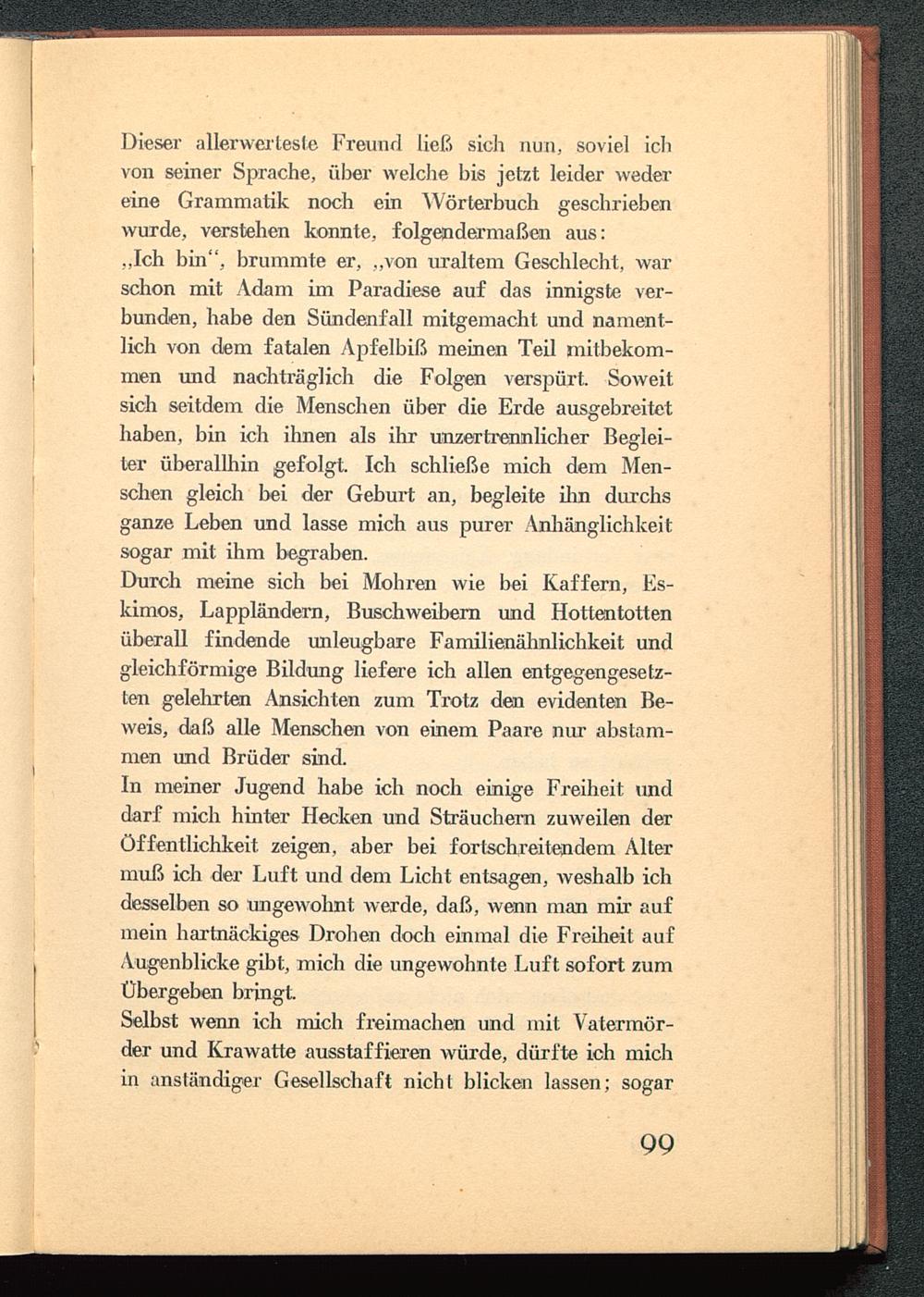 Dieser allerwertesle Freund ließ sich nun, soviel ichvon seiner Sprache, über welche bis jetzt leider wedereine Grammatik noch ein Wörterbuch geschriebenwurde, verstehen konnte, folgendermaßen aus:,,Ich bin", brummte er, „von uraltem Geschlecht, warschon mit Adam im Paradiese auf das innigste ver-bunden, habe den Sündenfall mitgemacht und nament-lich von dem fatalen Apfelbiß meinen Teil mitbekom-men und nachträglich die Folgen verspürt. Soweitsich seitdem die Menschen über die Erde ausgebreitethaben, bin ich ihnen als ihr unzertrennlicher Beglei-ter überallhin gefolgt Ich schließe mich dem Men-schen gleich bei der Geburt an, begleite ihn durchsganze Leben und lasse mich aus purer Anhänglichkeitsogar mit ihm begraben.
